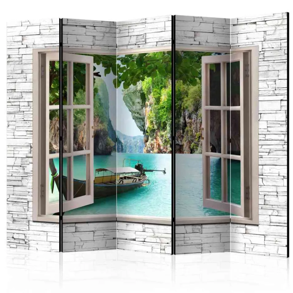 - Traumhaft schönes Motiv mit geöffnetem Fenster, Boot und Seenlandschaft in 3D-Optik