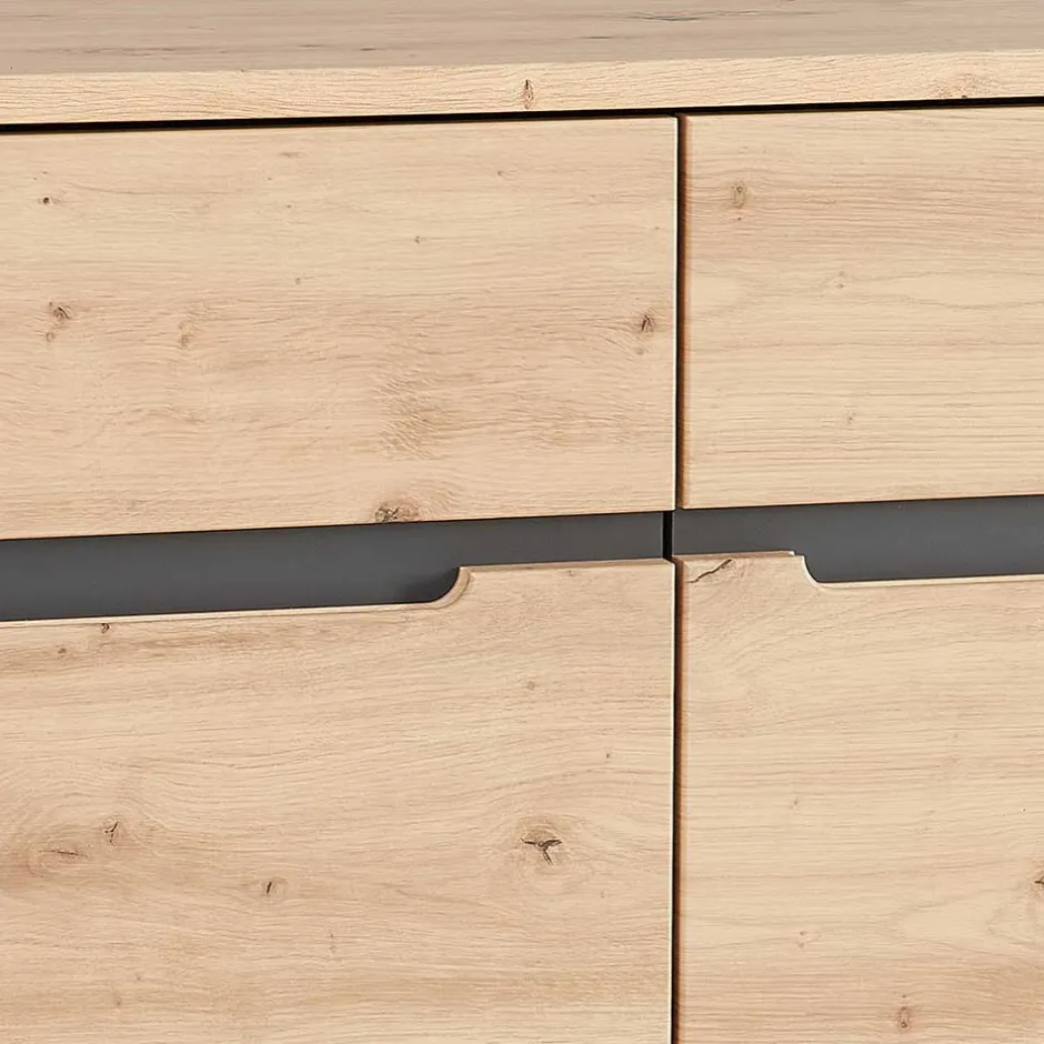 - Pflegeleicht folierte Oberflächen in Holzoptik Wildeiche und Dunkelgrau, Front mit tiefgezogenen Kanten