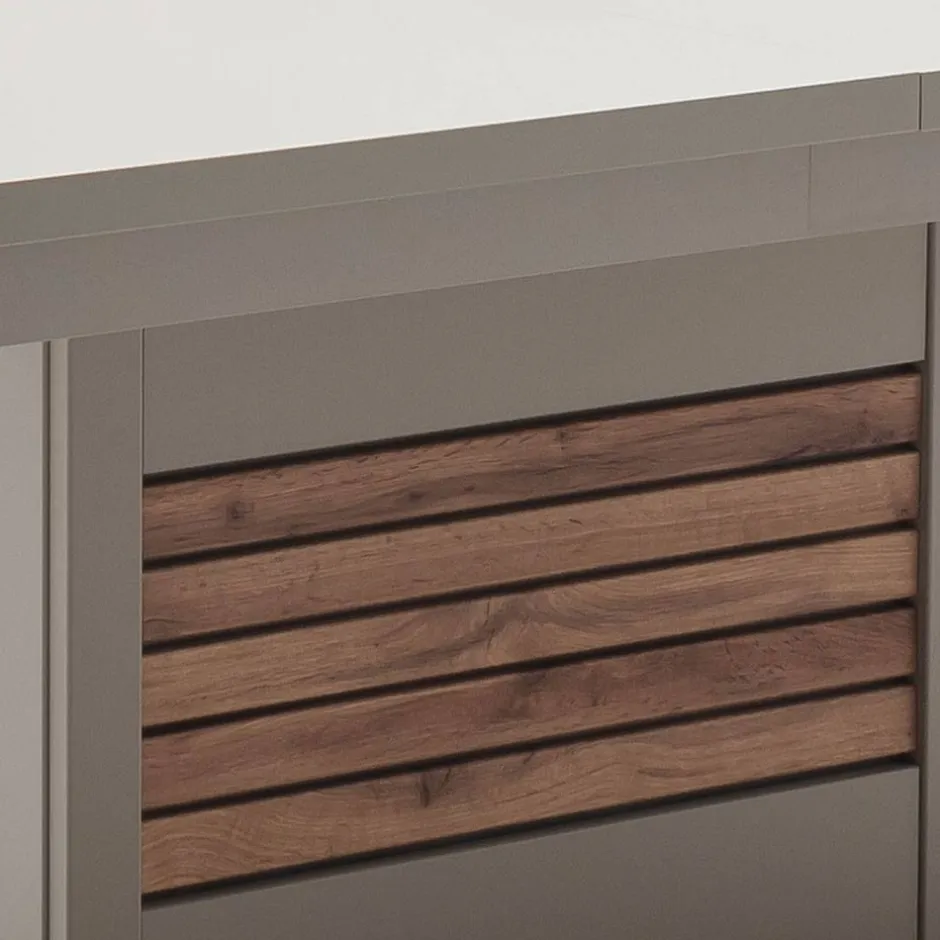 - Oberflächen grau melaminbeschichtet, Säule grau tiefgezogen foliert, Absetzungen in Holzoptik Wildeiche mit Schattenfugen foliert