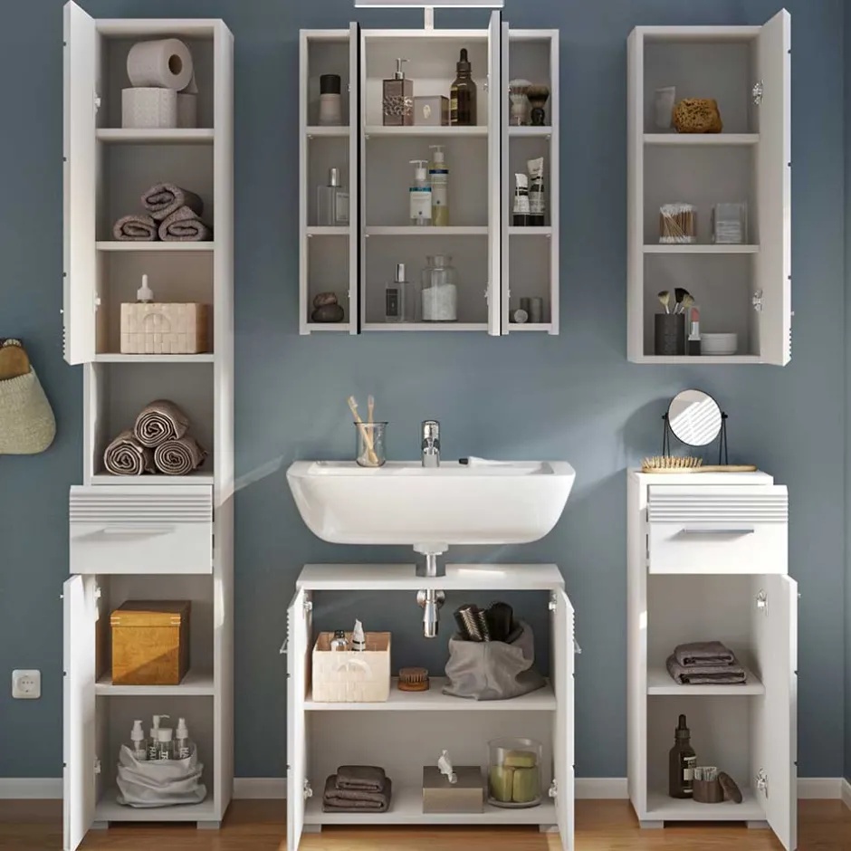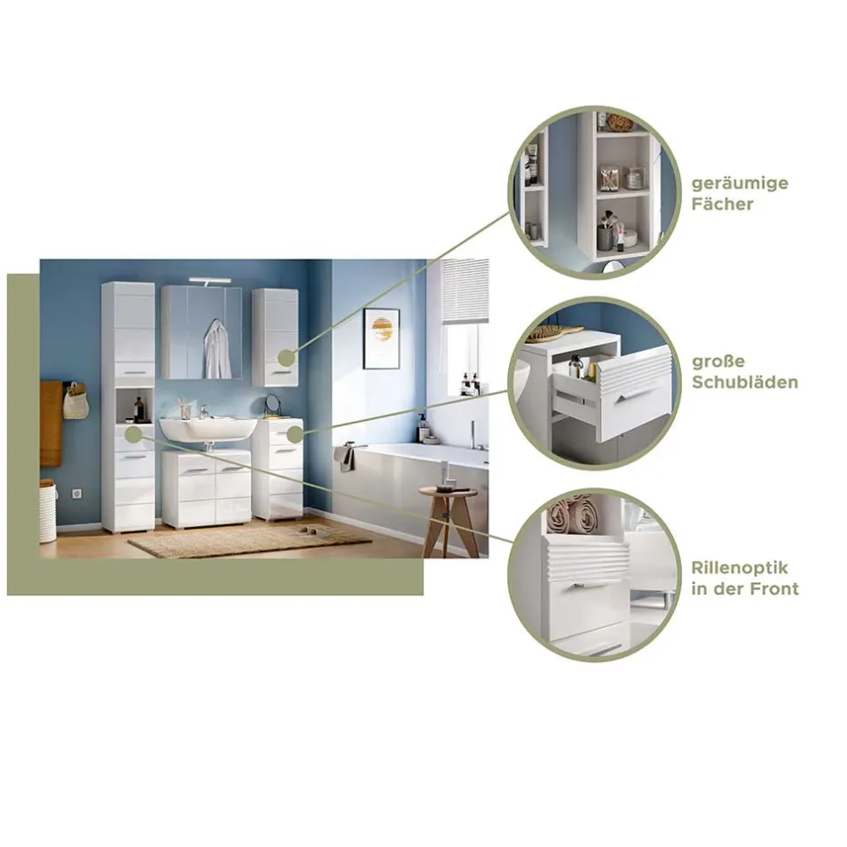 - Aus MDF, Spiegelglas (Front) und Spanplatte (Korpus) gefertigt