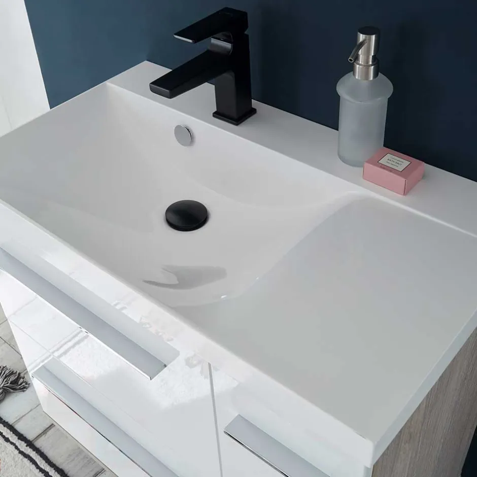 - Spiegel und Waschtisch zur Wandmontage, Schrank wahlweise hängend oder stehend, Kunststoff-Füße im Lieferumfang enthalten