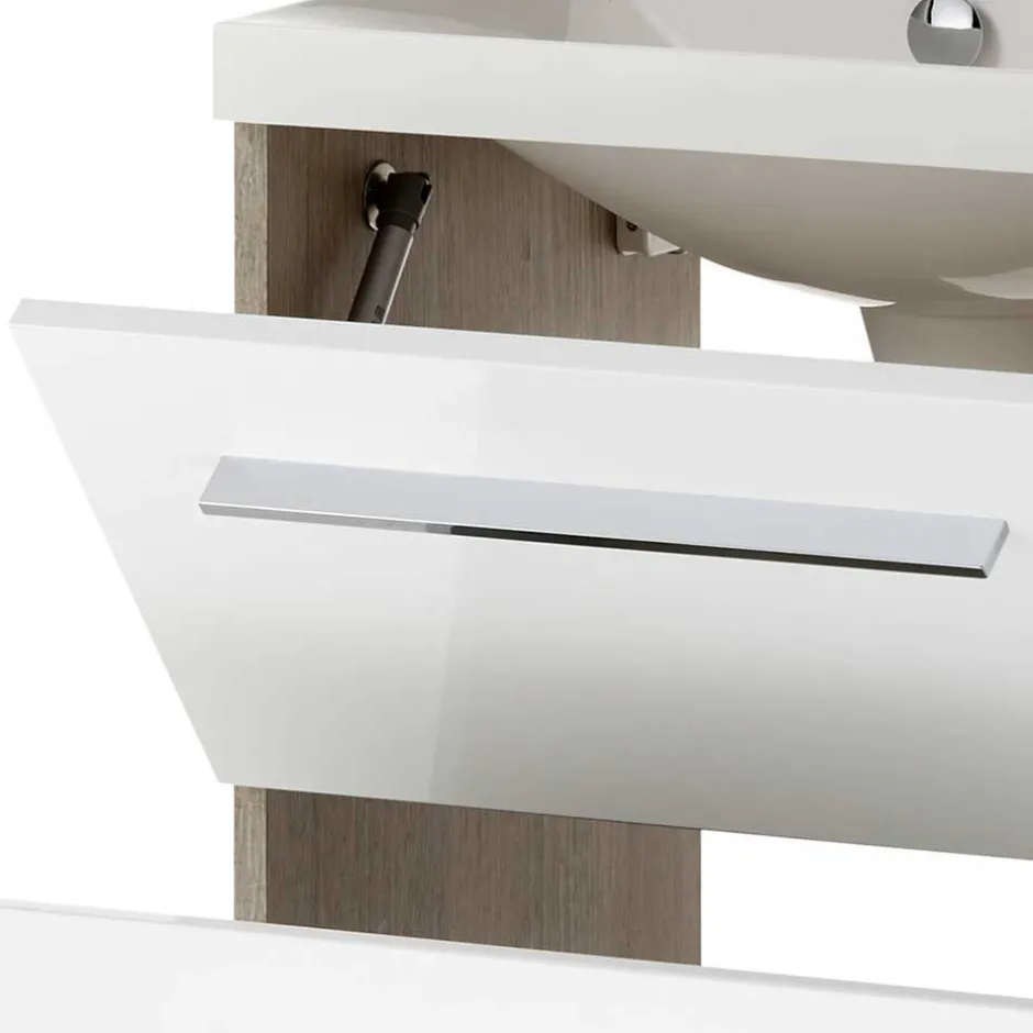 - Harmonische Badmöbel in Weiß und Eichefarben