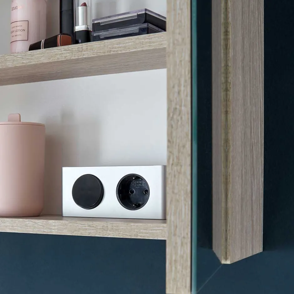 - Zwei Türen, innen zwei höhenverstellbare Böden und eine Schalter/Steckdosen Kombination