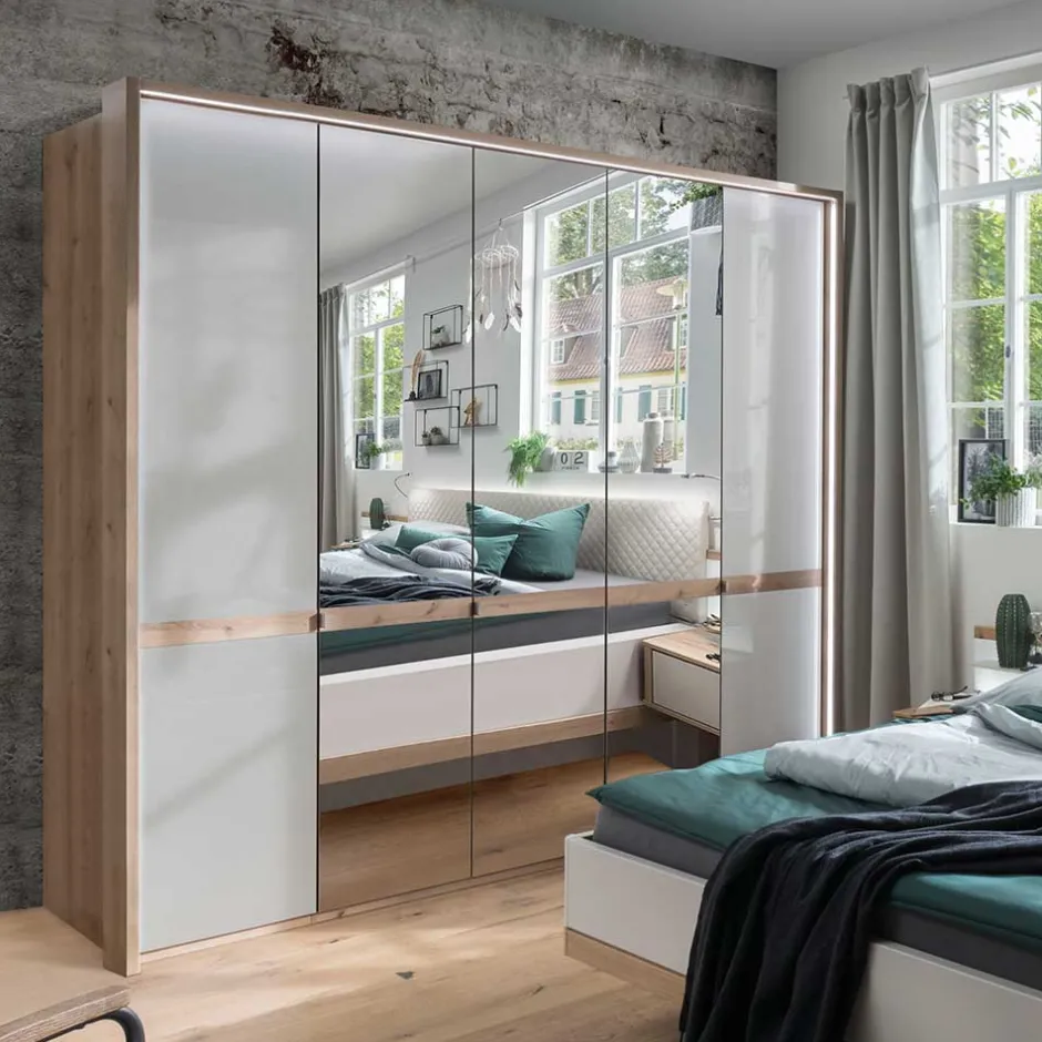 - Oberfläche der äußeren Türen mit Glas in Beige beschichtet, mittig Kristallglasspiegel, Korpus und Querriegel-Leiste in Holzoptik Eiche Bianco foliert