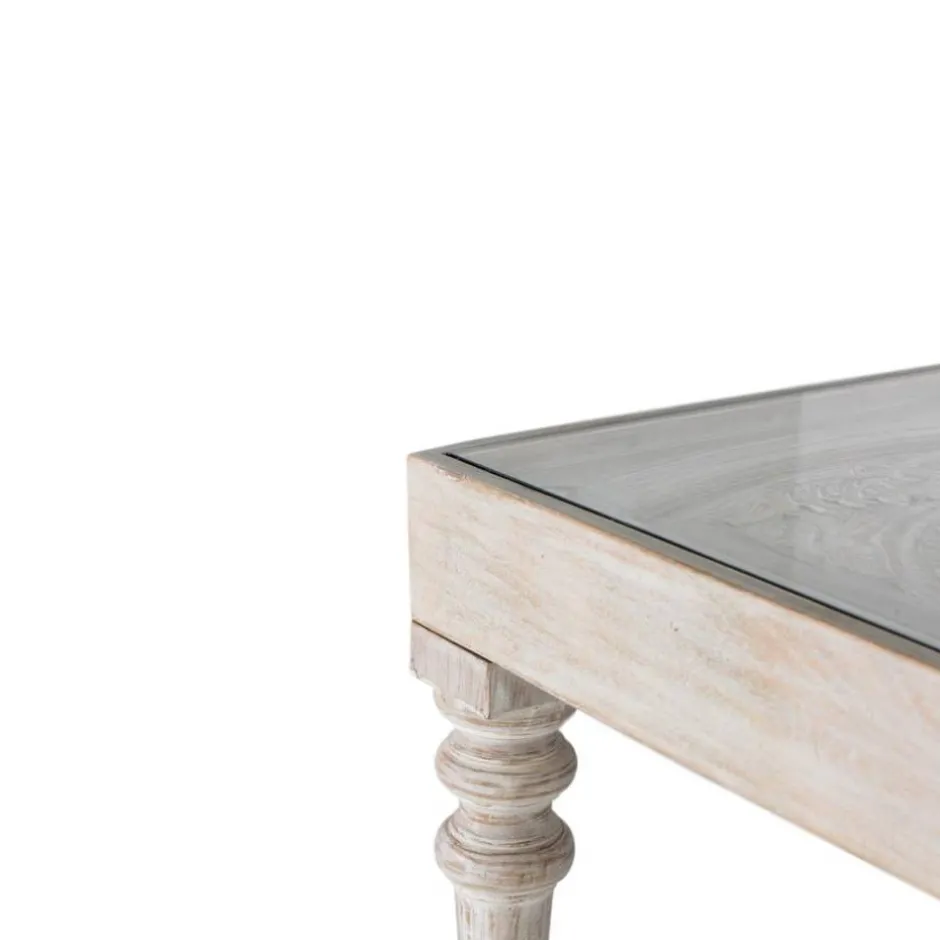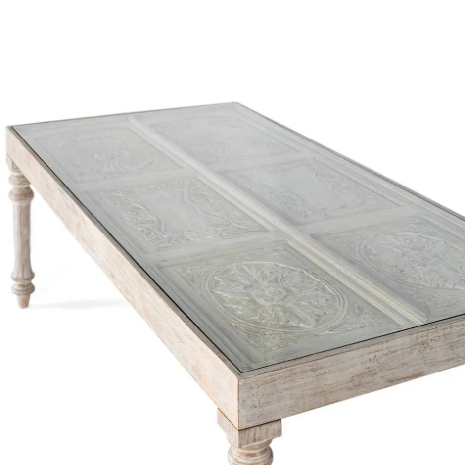- Aufwändig handbeschnitzte Tischplatte mit 8 mm Glasauflage