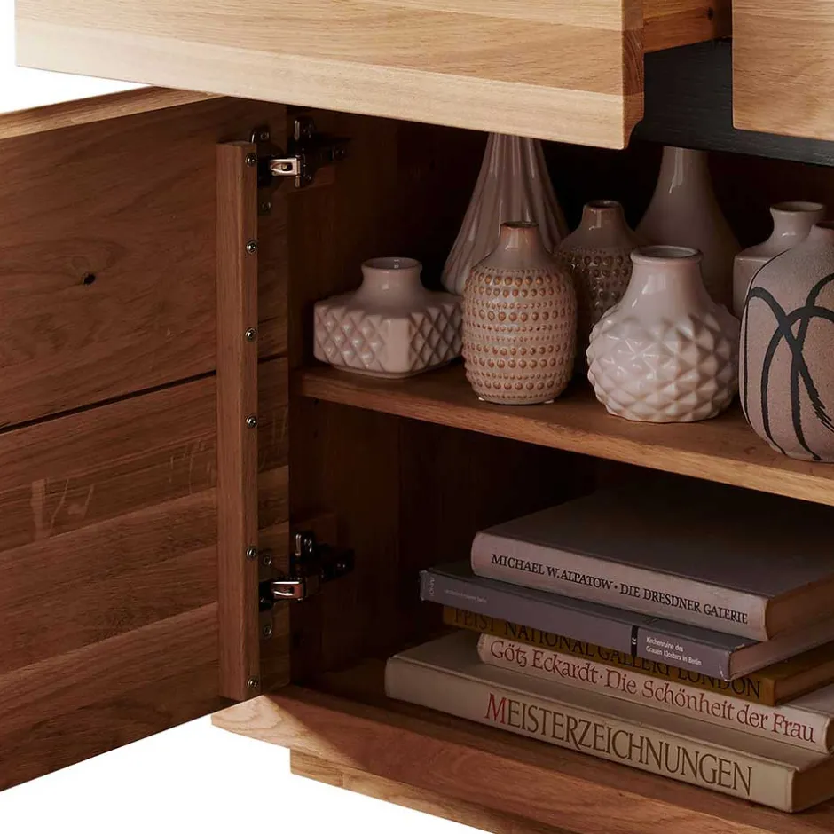 - Schwarze Applikationen und dekorative Hirnholzeinsätze lockern die Optik auf