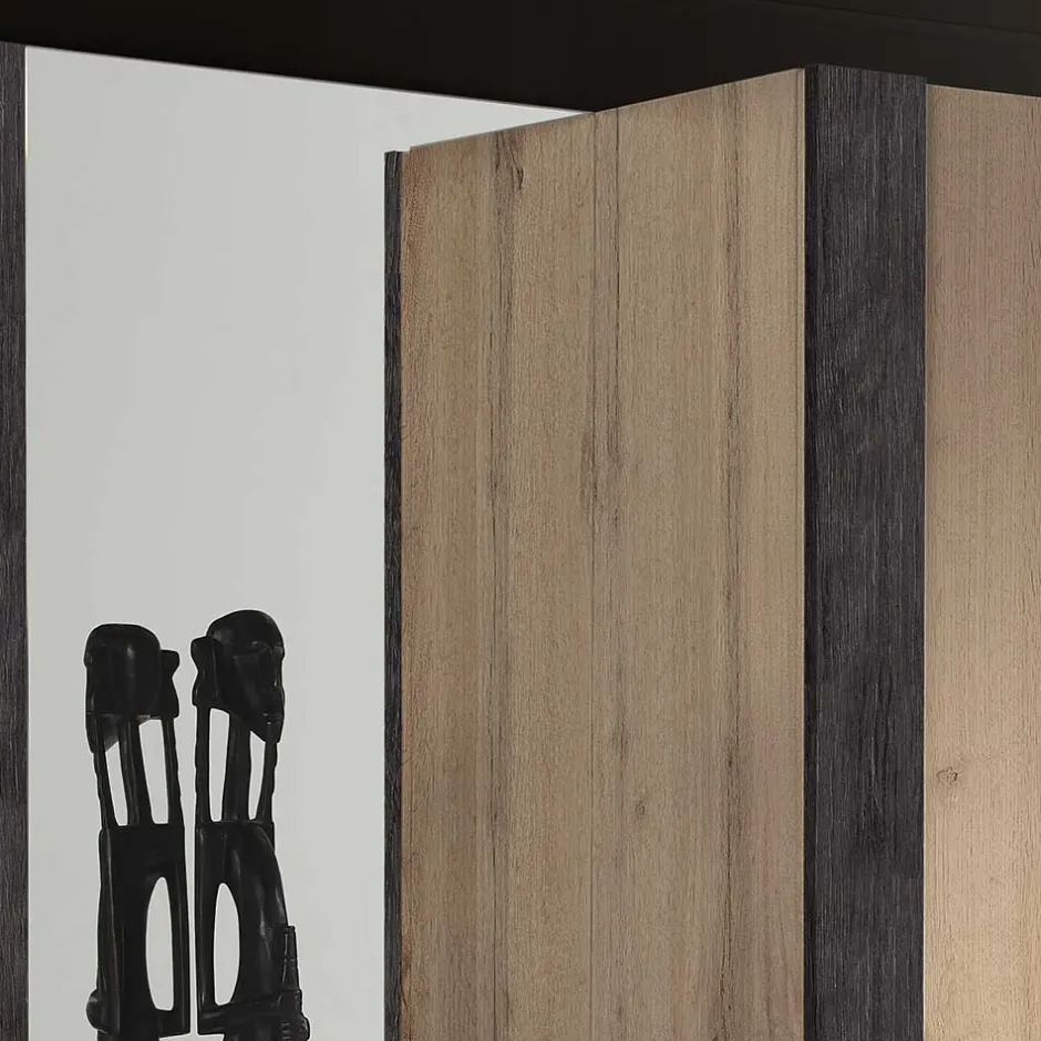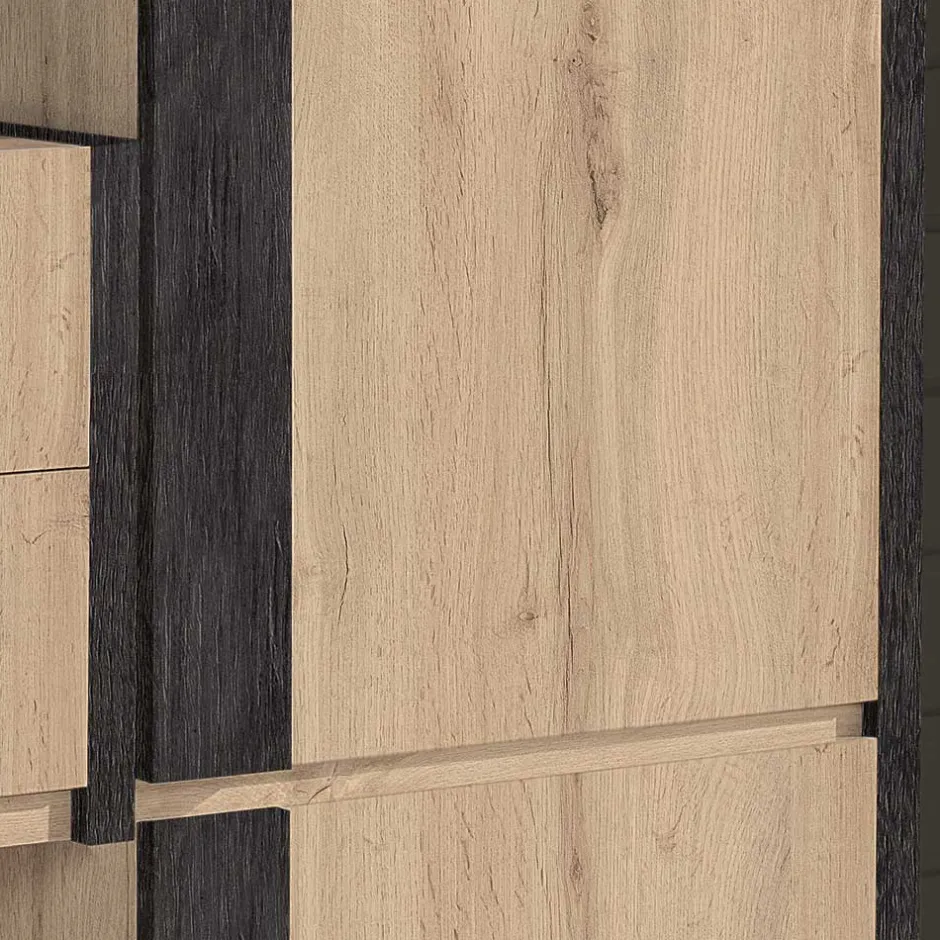 - Melaminbeschichtete Oberfläche in wildeichefarbiger und schwarzgrauer Holzoptik