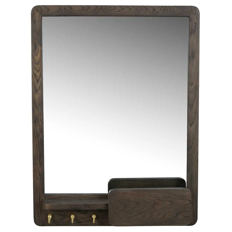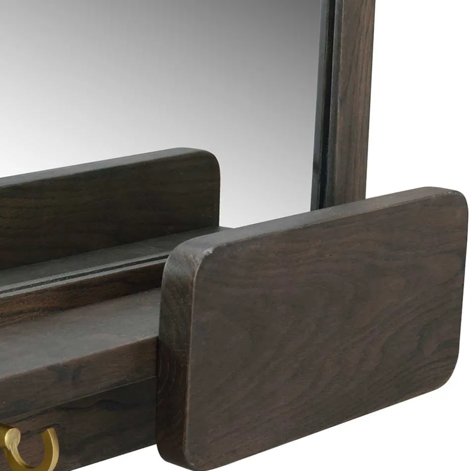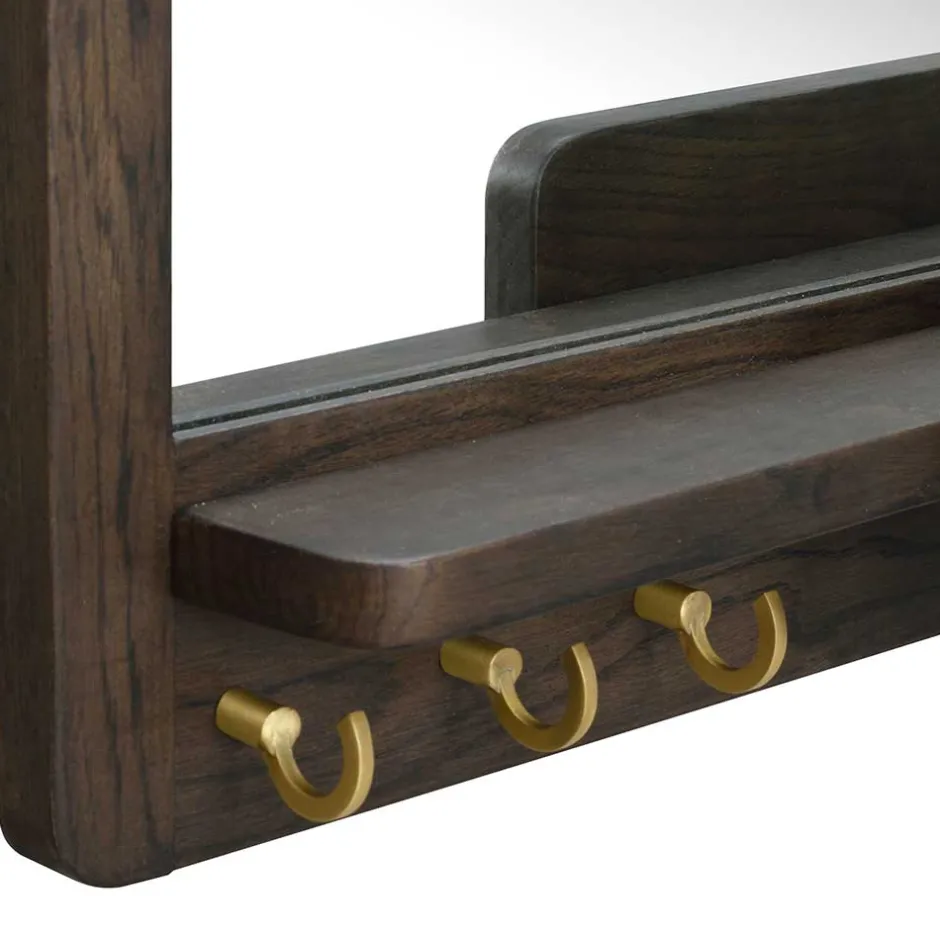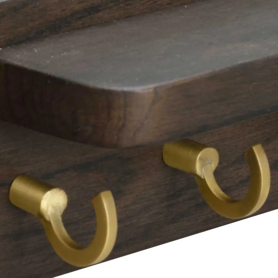- Dekorativer Holzrahmen mit einer praktischen Ablage und drei Metallhaken in Messingfarben gebürstet