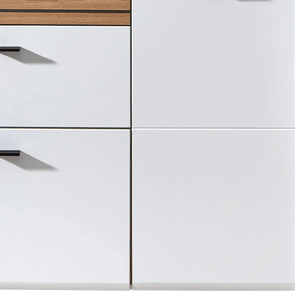 - Oberflächen Korpus weiß melaminbeschichtet, Front in Weiß matt und in Wildeiche Holzoptik foliert