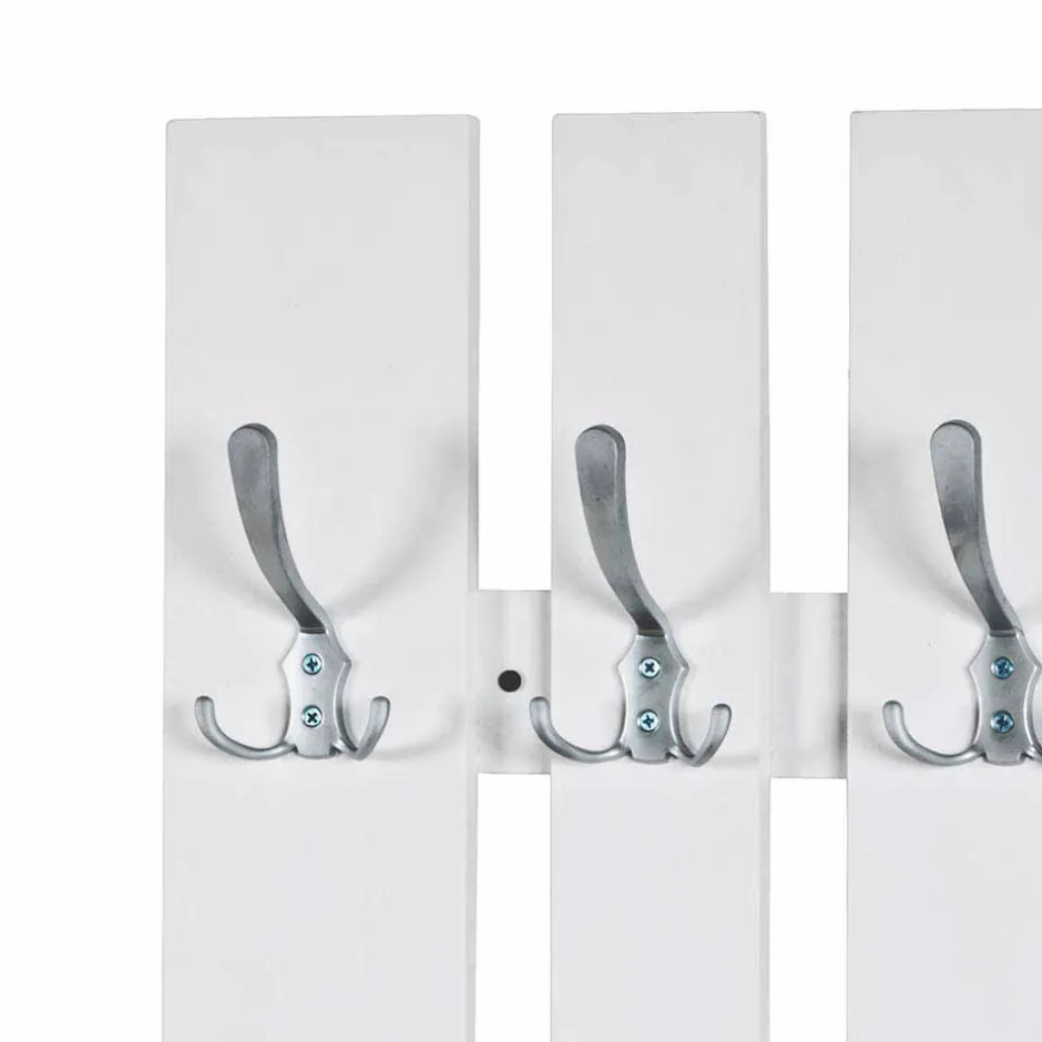 - Insgesamt acht Metallkleiderhaken in Edelstahloptik, auf zwei verschiedenen Ebenen angebracht