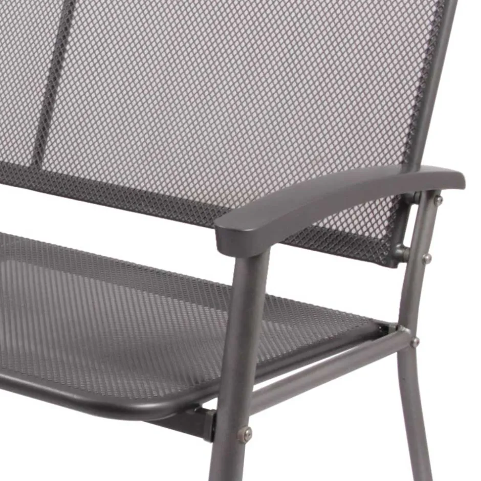 - Stabile Rückenlehne und Sitz aus Streckmetall, oberer Holm in leichtem Bogen, Lehne ist durch Längsstreben in die drei Teile unterteilt