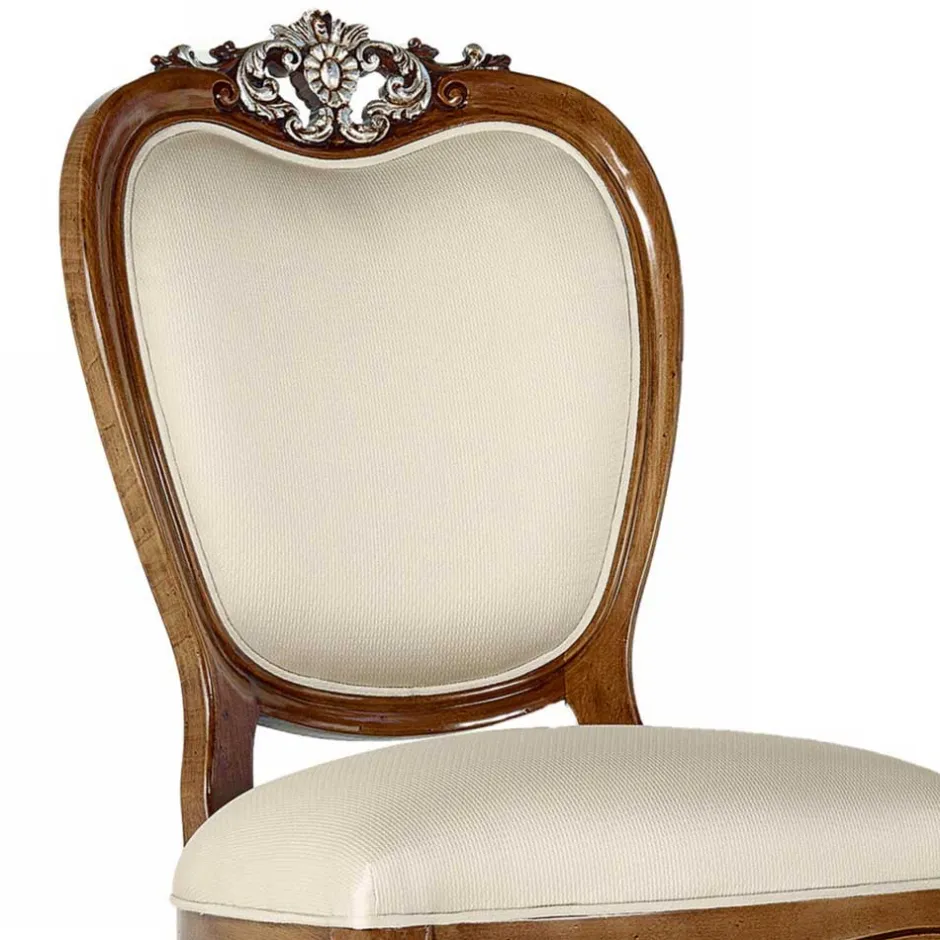 - Rückenlehne in Medaillonform mit silberfarbig lackierter Schnitzerei
