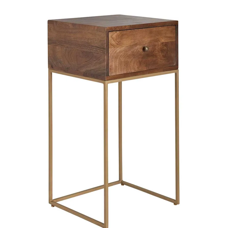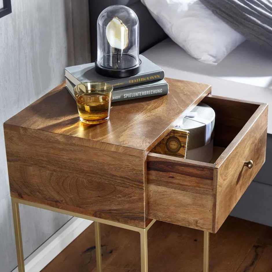 - Hohe Nachtkommode in Mangoholz und Goldfarben