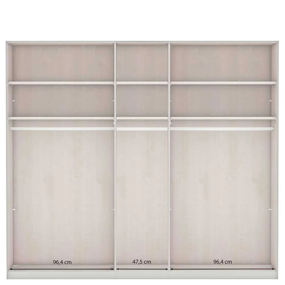 - Drei Fachelemente innen, Breite: 96,4/47,5/96,4 cm, jeweils mit zwei Einlegeböden und einer Kleiderstange ausgestattet