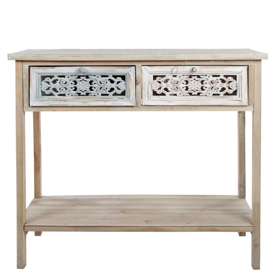 - Zwei Schubladen mit Holzauszug, Front dekorativ beschnitzt, eine in Hellblau