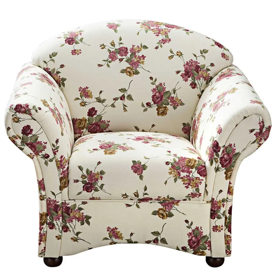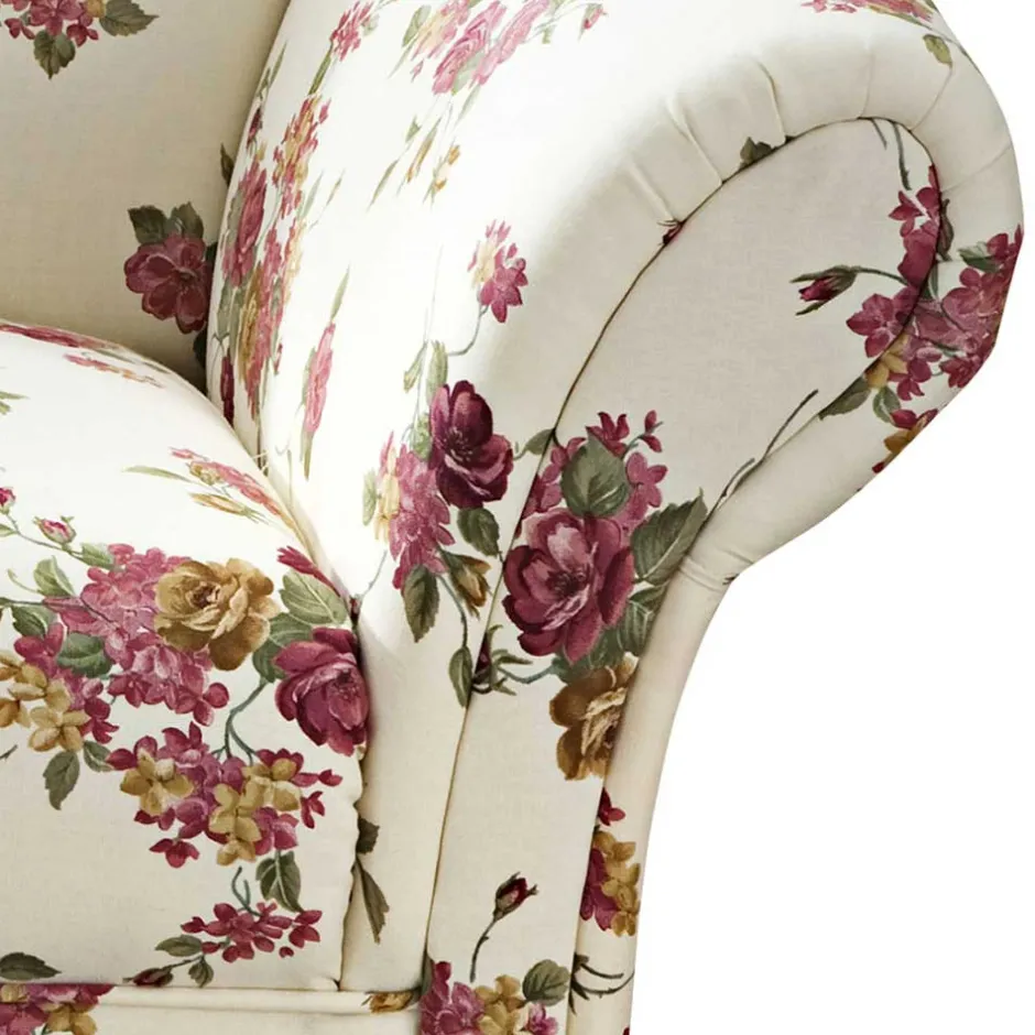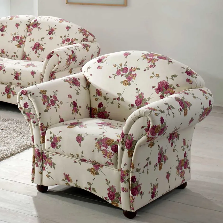 - Verspielter Sessel in Beige, bunt geblümt und Nussbaumfarben