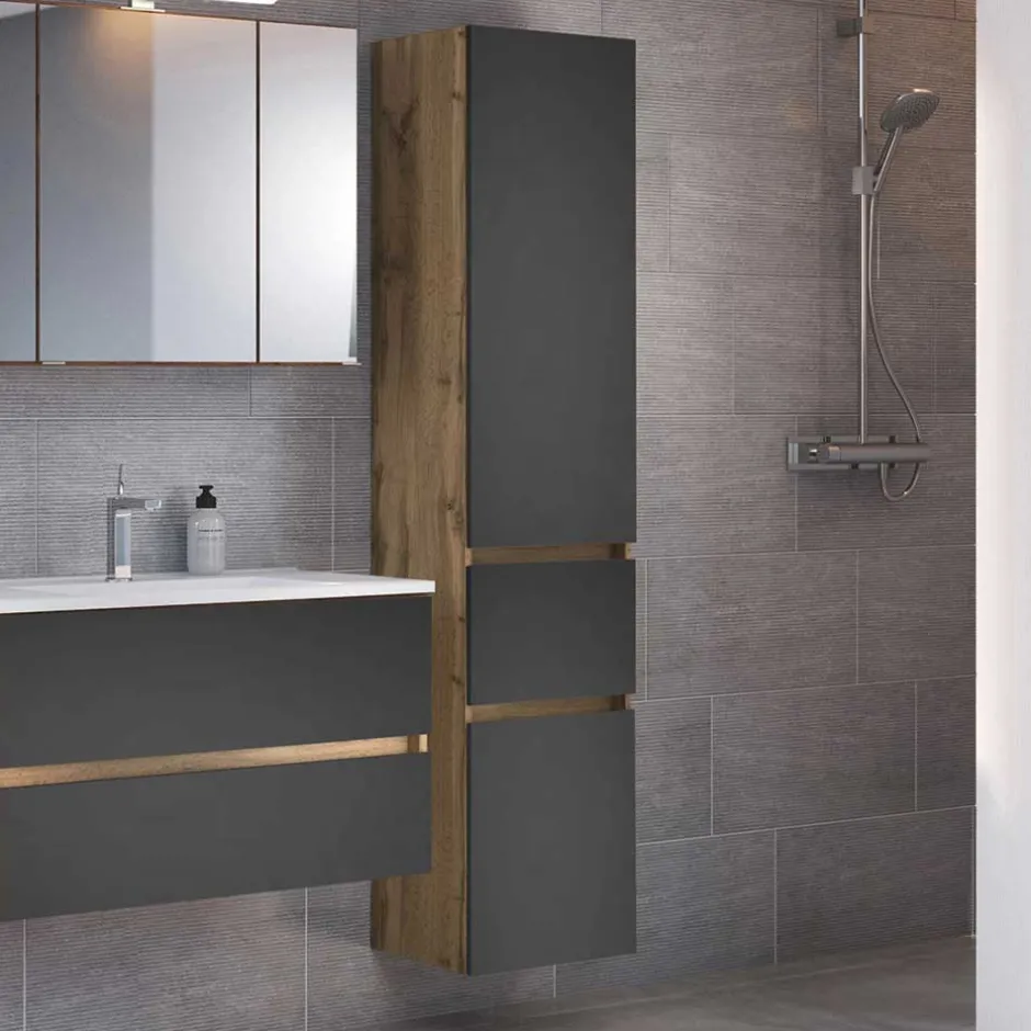 - Klasse Bad Hochschrank in Wildeichefarben und Dunkelgrau