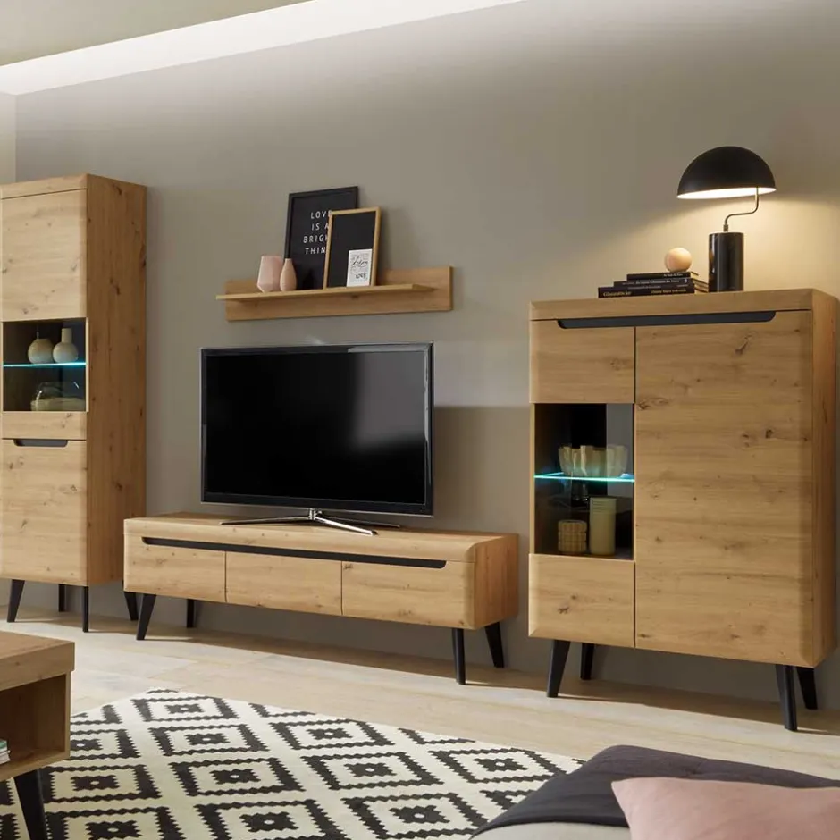 - Trendige Wohnwand in Wildeichefarben und Schwarz