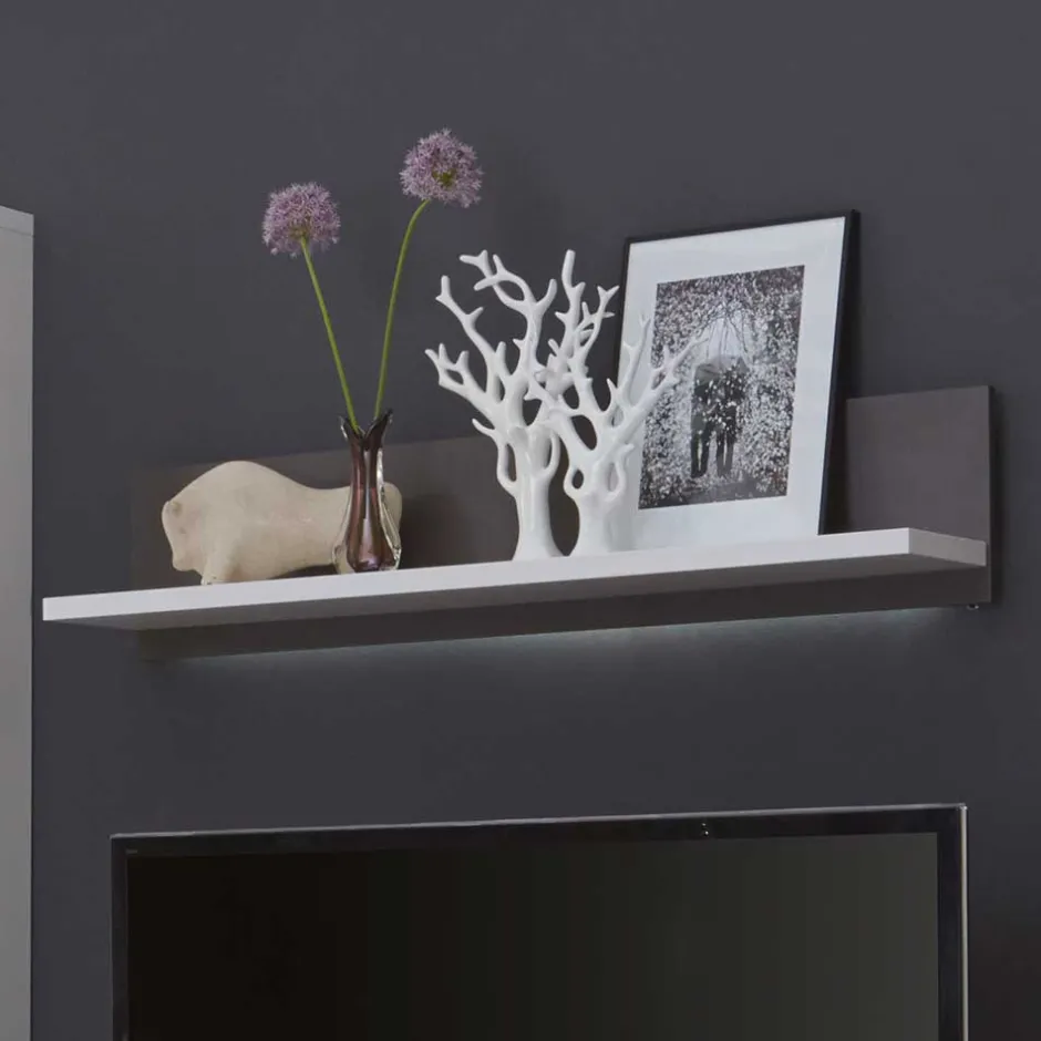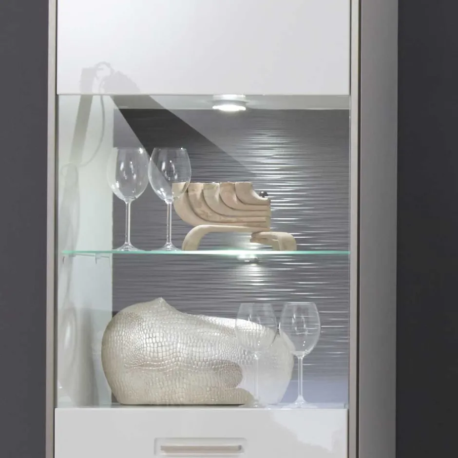 - Optional mit LED-Beleuchtung erhältlich: weißer LED-Spot (Vitrine und Hängeelement), Glasbodenbeleuchtung (Vitrine), LED-Band 115 cm lang (Wandboard)