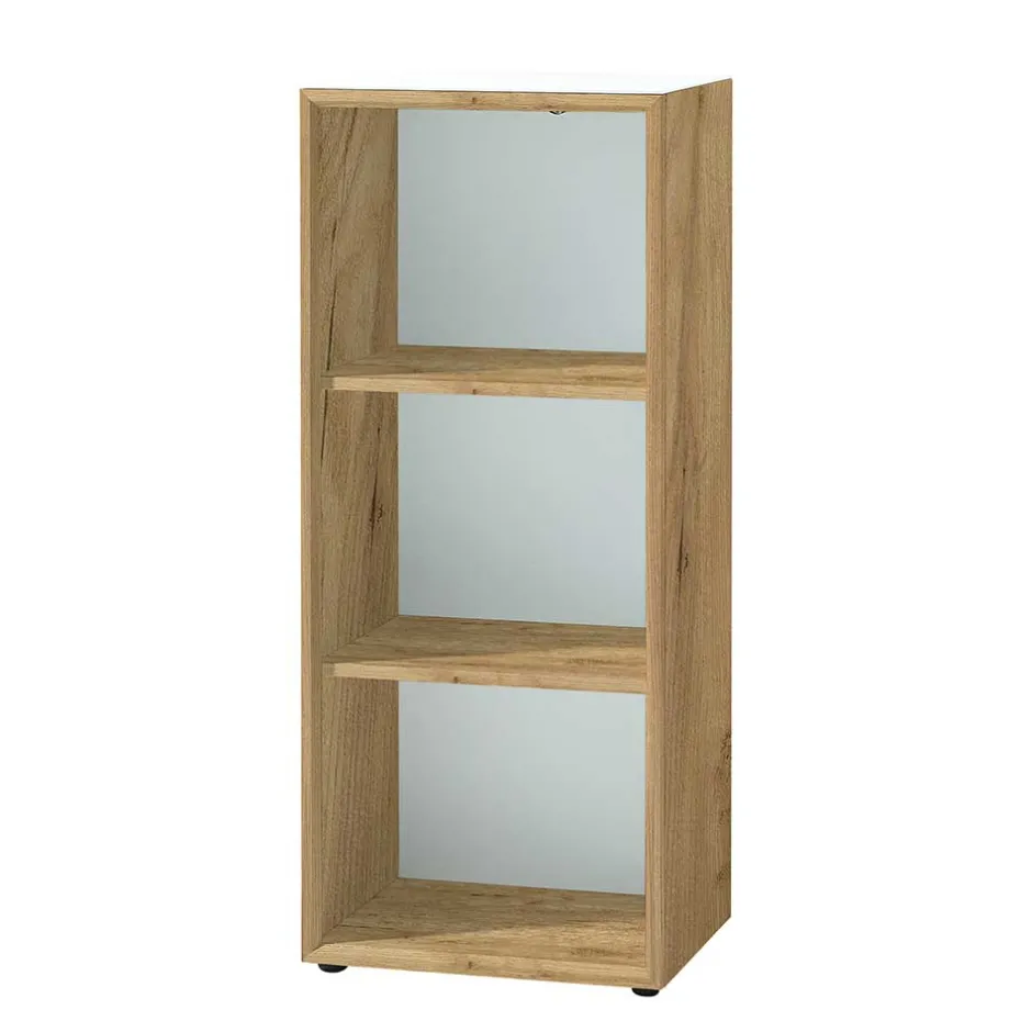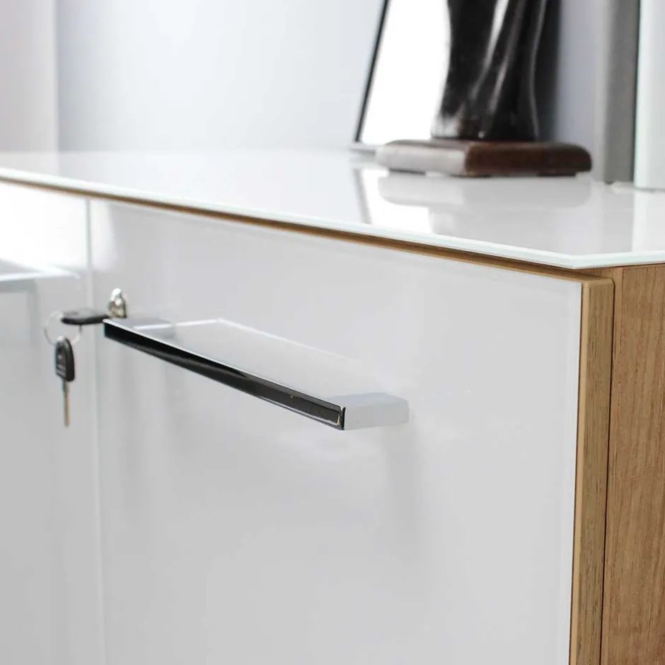 - Melaminbeschichtete Oberfläche in Weiß und in Holzoptik Wildeiche, Türen und Oberplatten zusätzlich mit Sicherheitsglas beschichtet