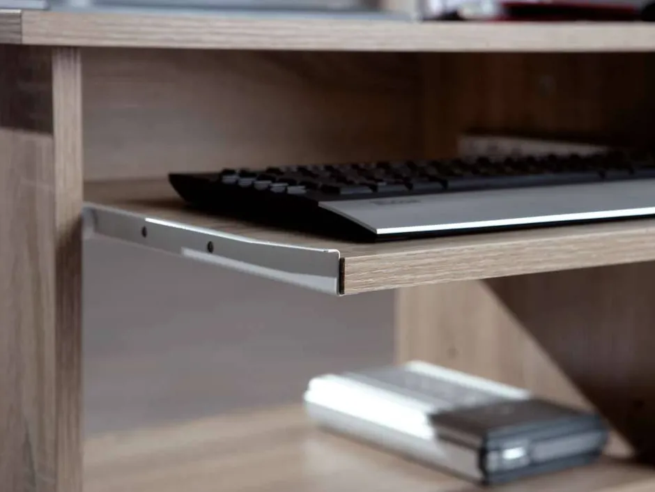 - Mit einem Tastaturauszug und Platz für Rechner und Drucker ausgestattet