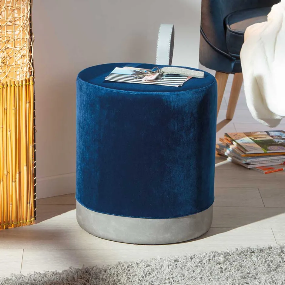- Bezug aus weichem Samt (100 % Polyester) in Blau und Kunstleder (100 % Polyurethan) in Hellgrau