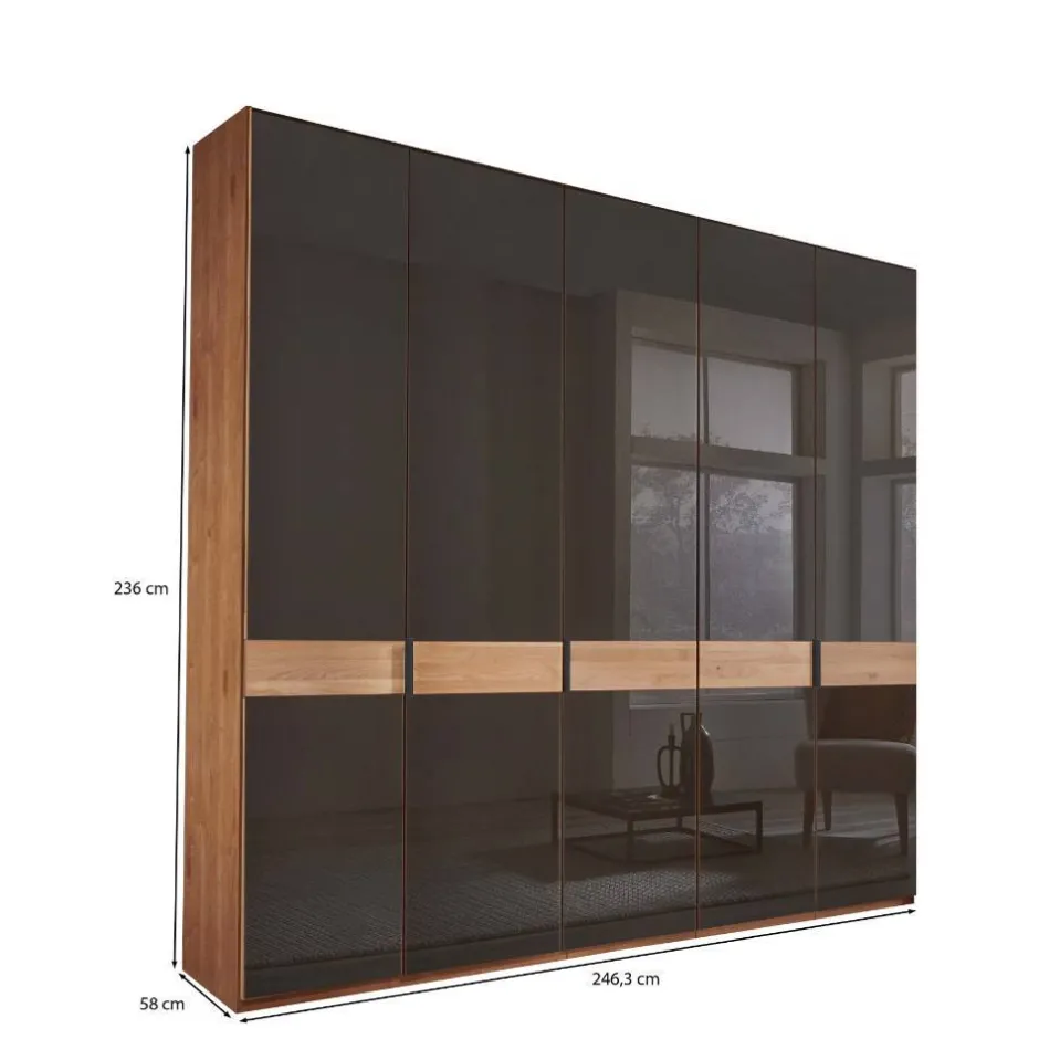 - Fünf Türen aus Holzwerkstoff mit dunkelbrauner Glasbeschichtung, Bauchbinde Massivholz, Soft Close Metallscharniere