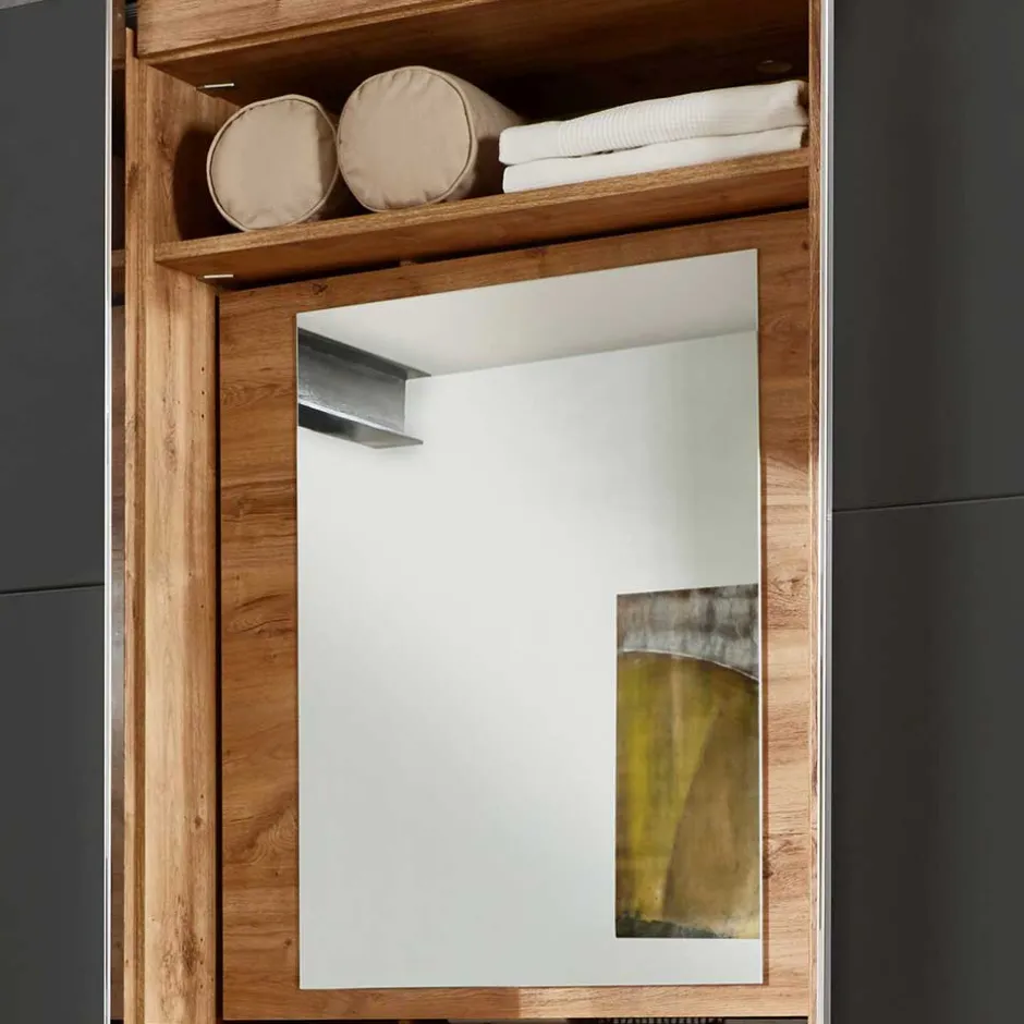 - Drei Facheinheiten, links und rechts jeweils eine Kleiderstange und zwei Einlegeböden, mittig zwei offene Fächer, hinter dem Spiegel zwei Einlegeböden