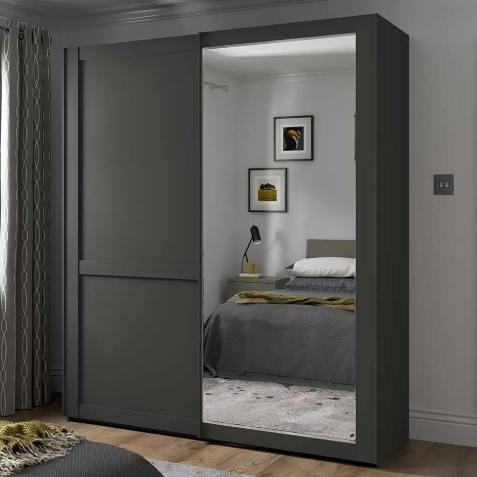 - Unempfindliche, folierte Oberflächen in Dunkelgrau, Innendekor in hellgrauer Holzoptik