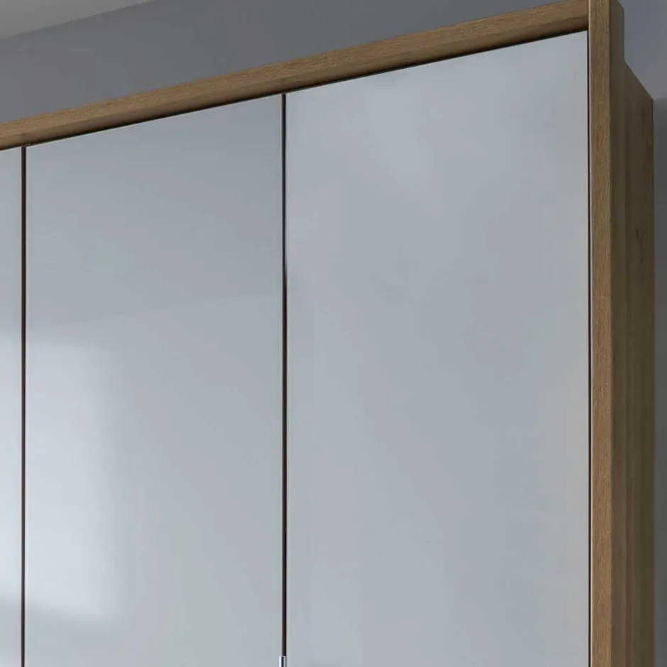 - Oberflächen Front von Schrank und Nachtkommoden mit weißem Glas beschichtet, Korpus in Holzoptik Eiche Bianco foliert