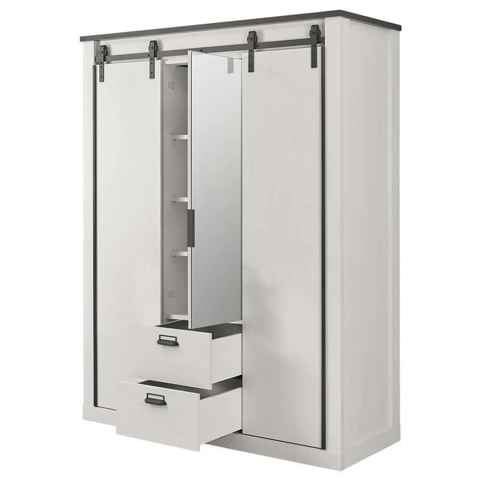 - Zwei Schiebetüren außen und eine Drehtür mit Spiegel mittig
