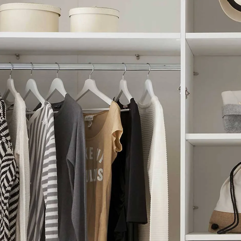 - Innen zwei Facheinheiten, links eine Kleiderstange und ein Einlegeboden, rechts vier Einlegeböden