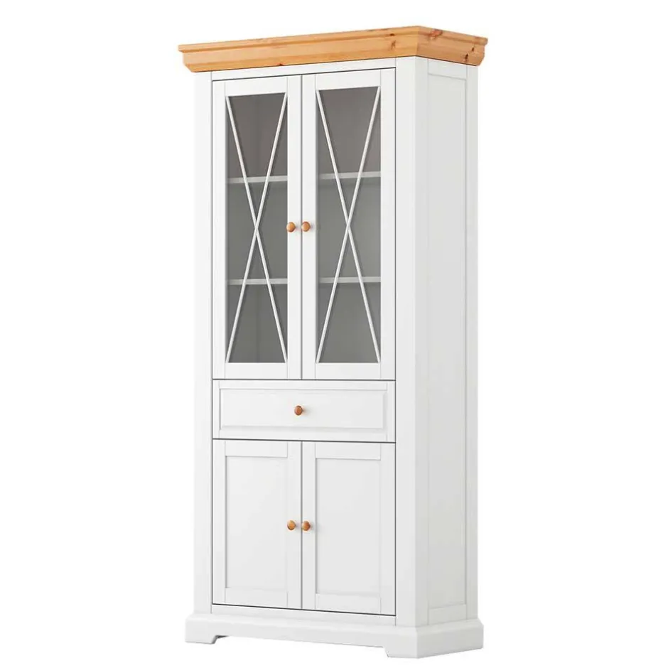- Oberflächen weiß lackiert mit 85 % Deckkraft, Maserung leicht durchscheinend, RAL 9003, kieferfarbene Elemente gebeizt und lackiert