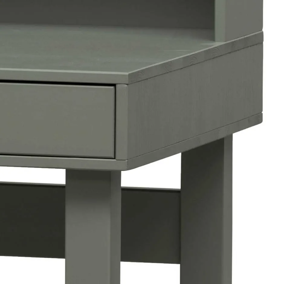 - Eine Schublade mit Metallauszug und ein offenes Fach unter der Tischplatte