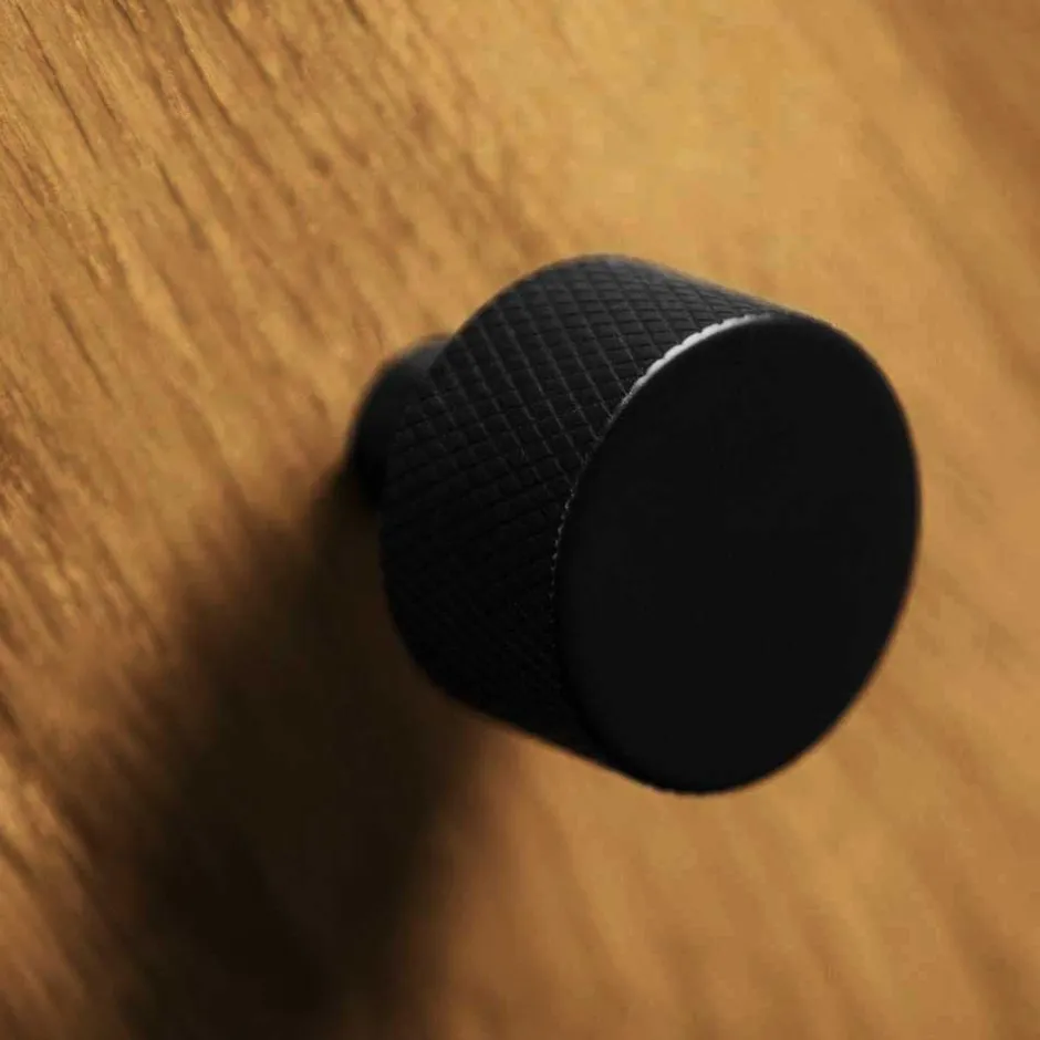 - Schwarze, zylinderförmige Metallgriffe mit eingraviertem Rautenmuster