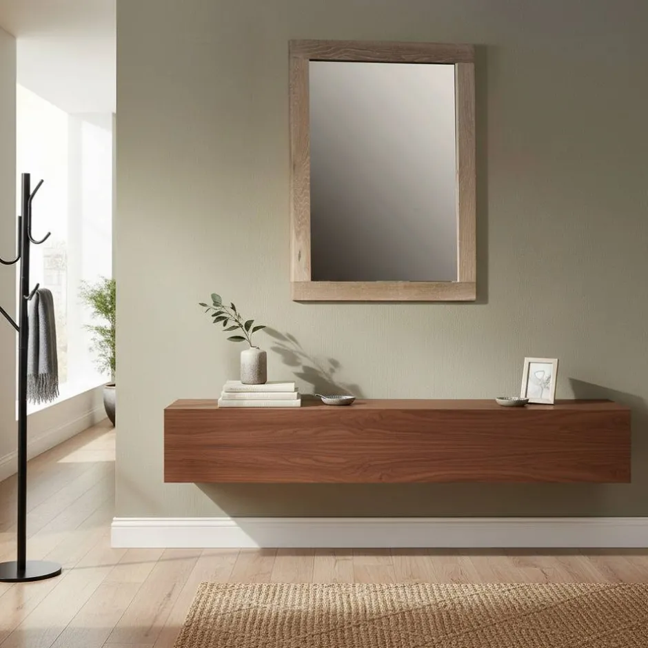 - Gefertigt aus brillantem Spiegelglas und Eiche Massivholz