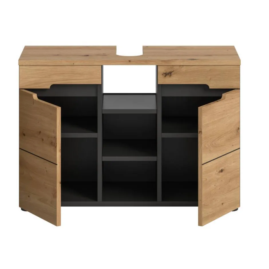 - Geräumiger Waschbeckenunterschrank in Wildeiche Holzoptik und Grau