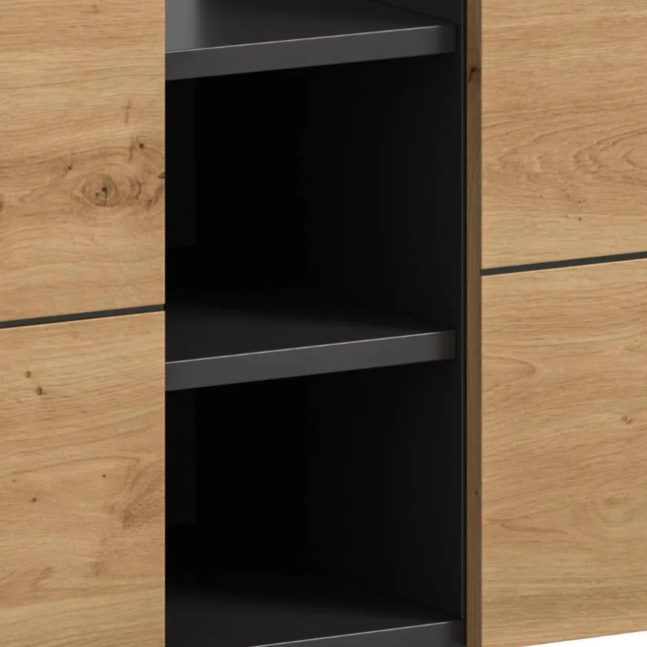 - Hinter jeder Tür ein Einlegeboden, mittig zwei offene Fächer