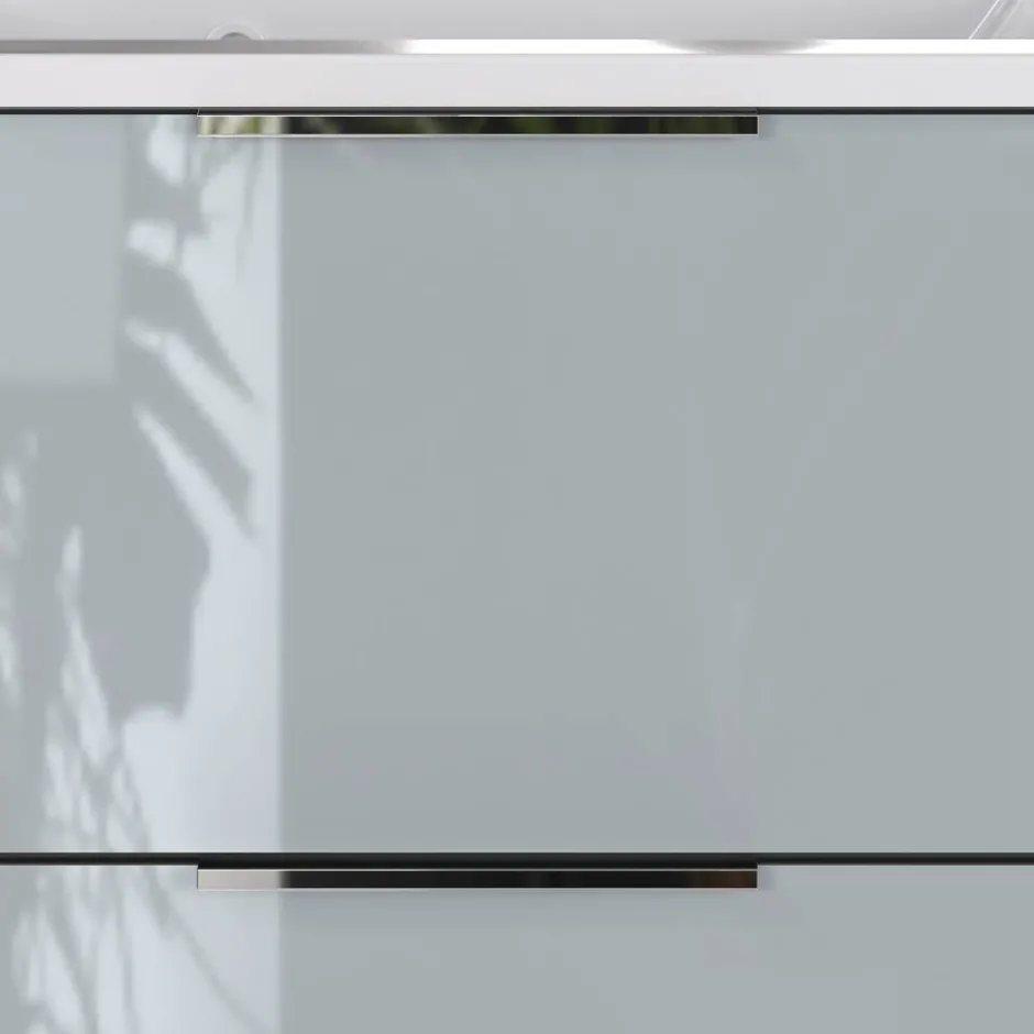 - Oberflächen in Dunkelgrau melaminbeschichtet, Front mit Glas in Silbergrau beschichtet