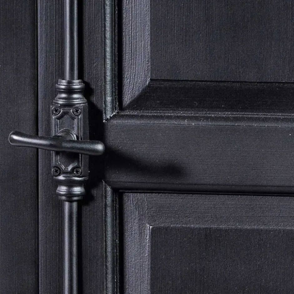- Metall-Klappgriffe an den Schubladen, Schlossstange mit Knebel zum Drehen an der Tür