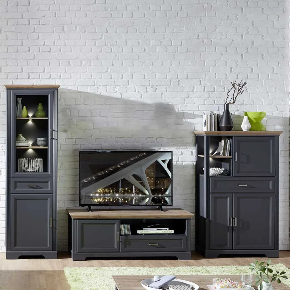 - Geschmackvolle Wohnwand in Dunkelgrau und Eichefarben