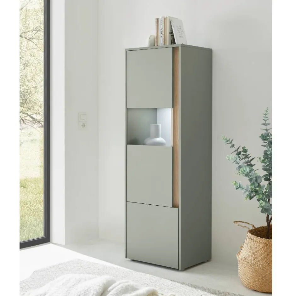 - Trendige Vitrine in Graugrün und Eichefarben