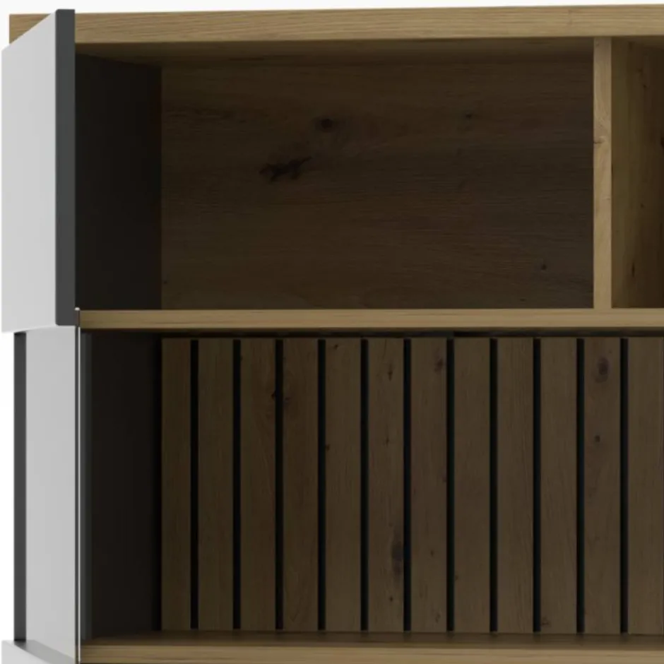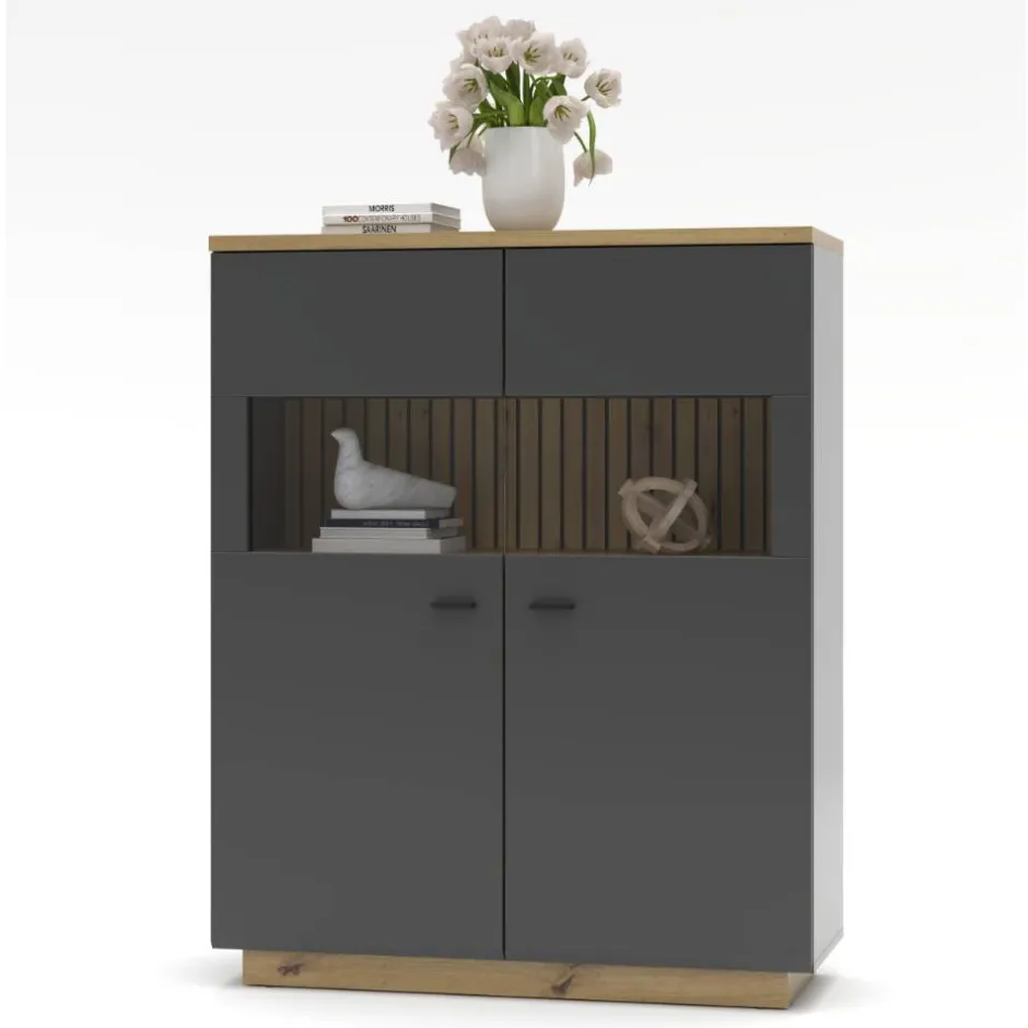 - Ansprechende Highboard Vitrine in Dunkelgrau matt und Wildeichefarben