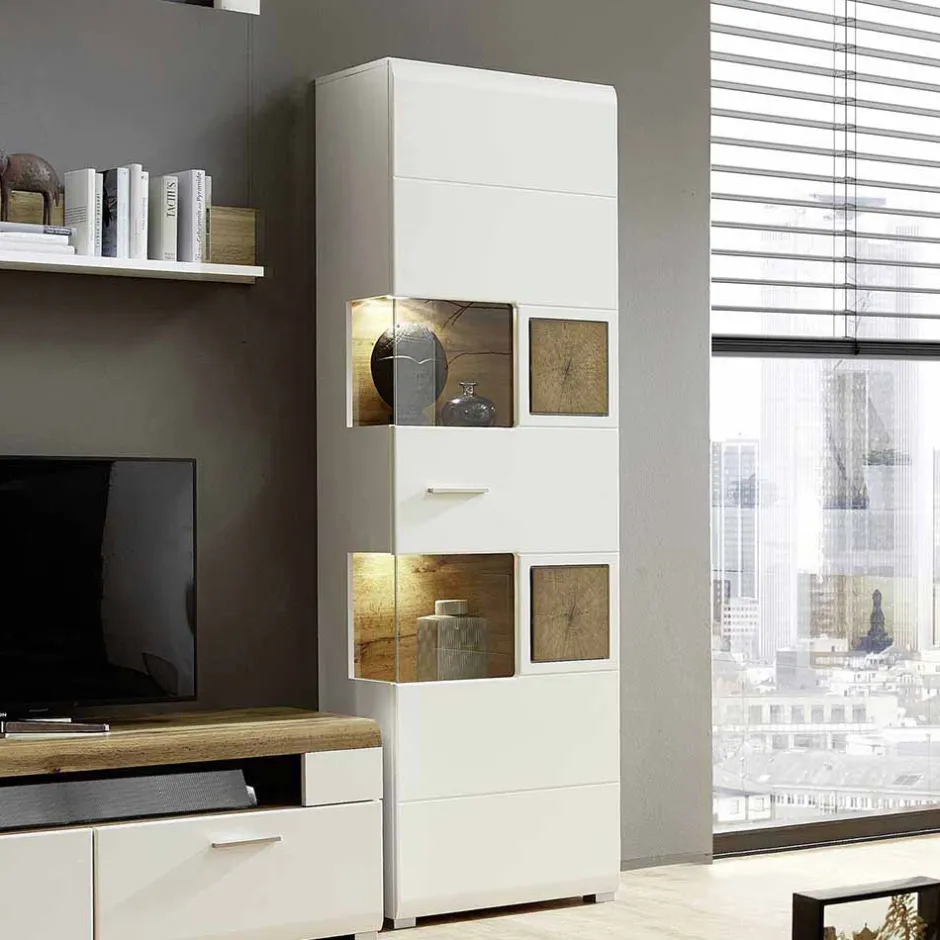 - Elegante Vitrine in Weiß matt und Eichefarben