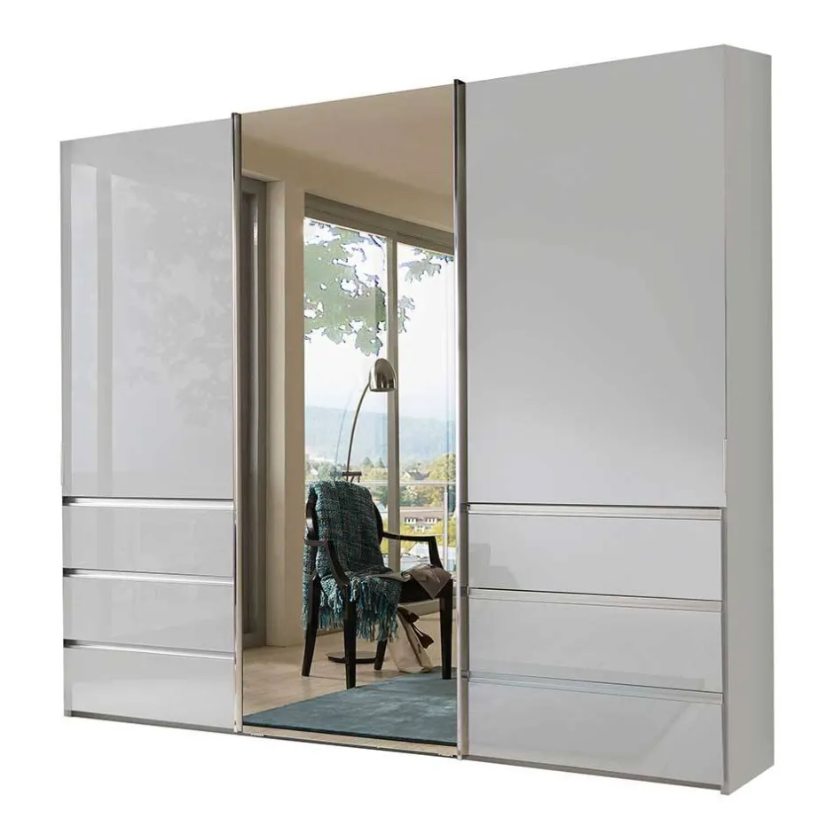 - Oberfläche der Front mit weißem Glas beschichtet, Korpus foliert, Innendekor in Silber-Grau gestreift