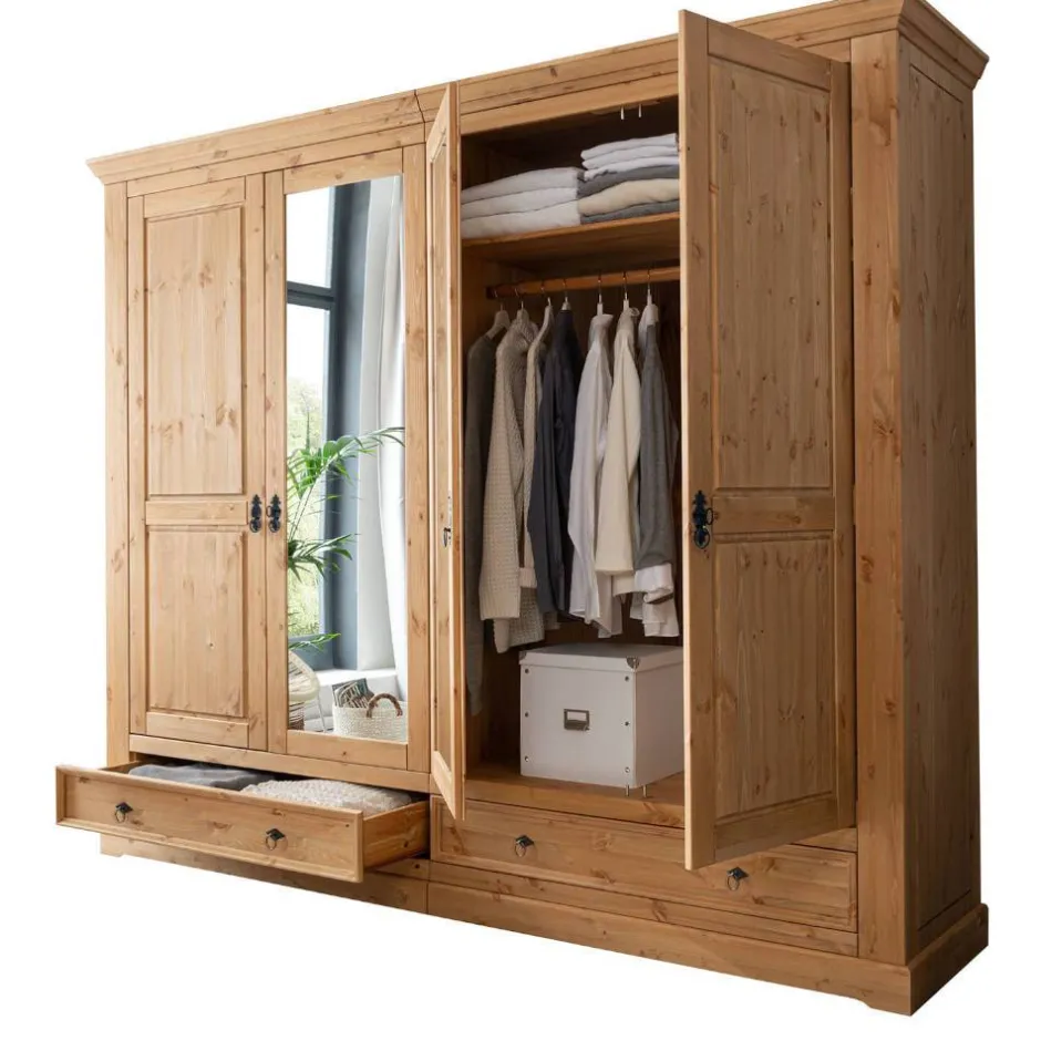 - Zwei Türfronten verspiegelt, zwei dekorativ in Kassettenoptik gestaltet