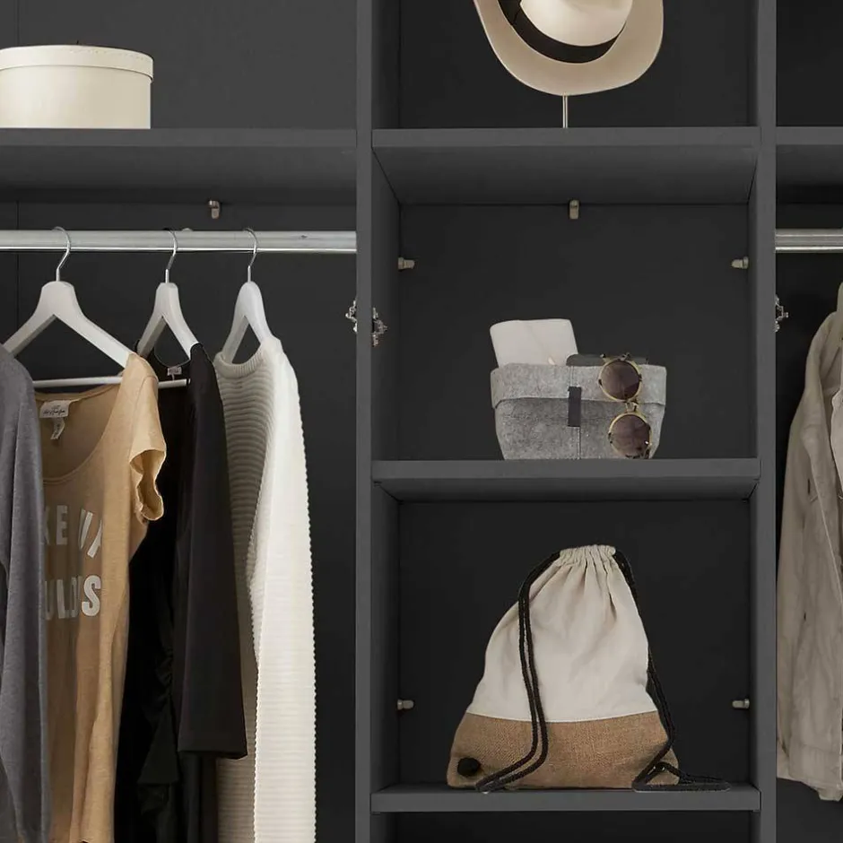 - Innen drei Facheinheiten, links und rechts je eine Kleiderstange und ein Einlegeboden, mittig vier Einlegeböden