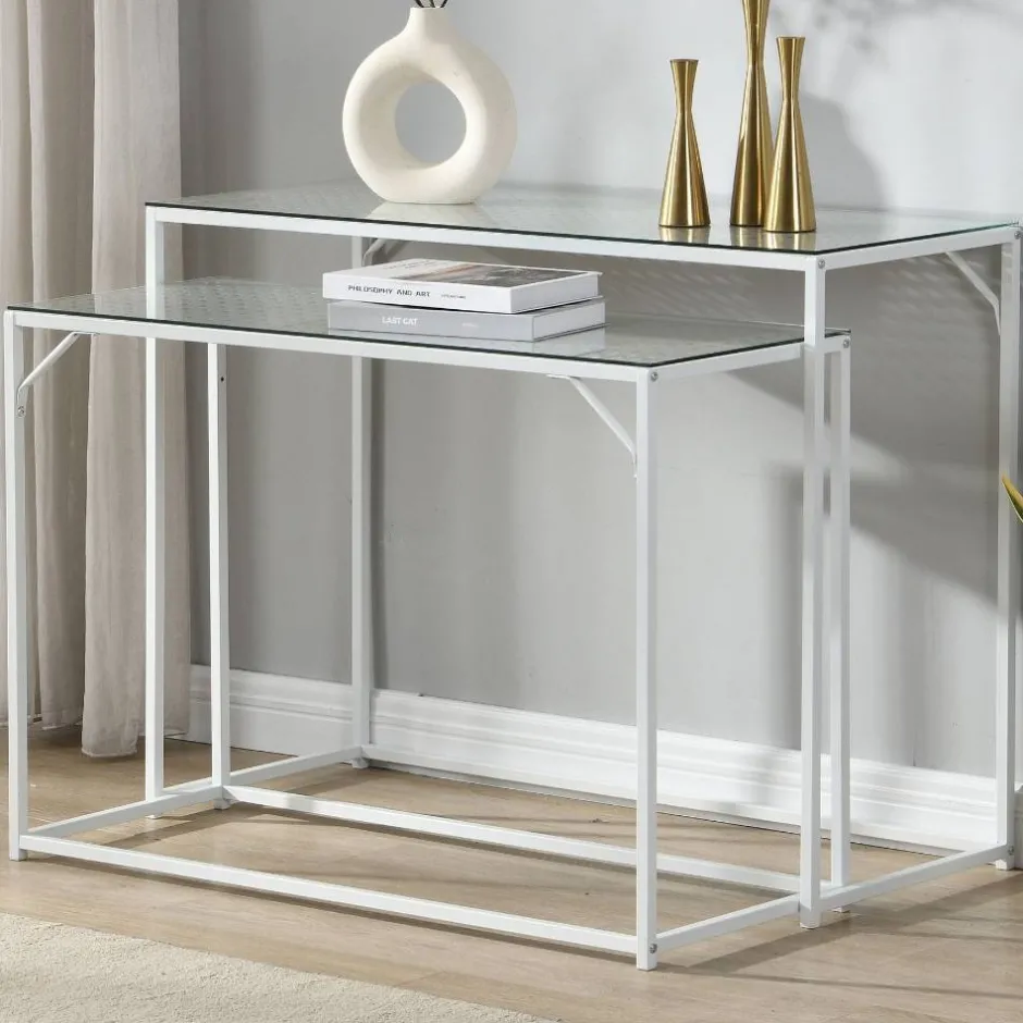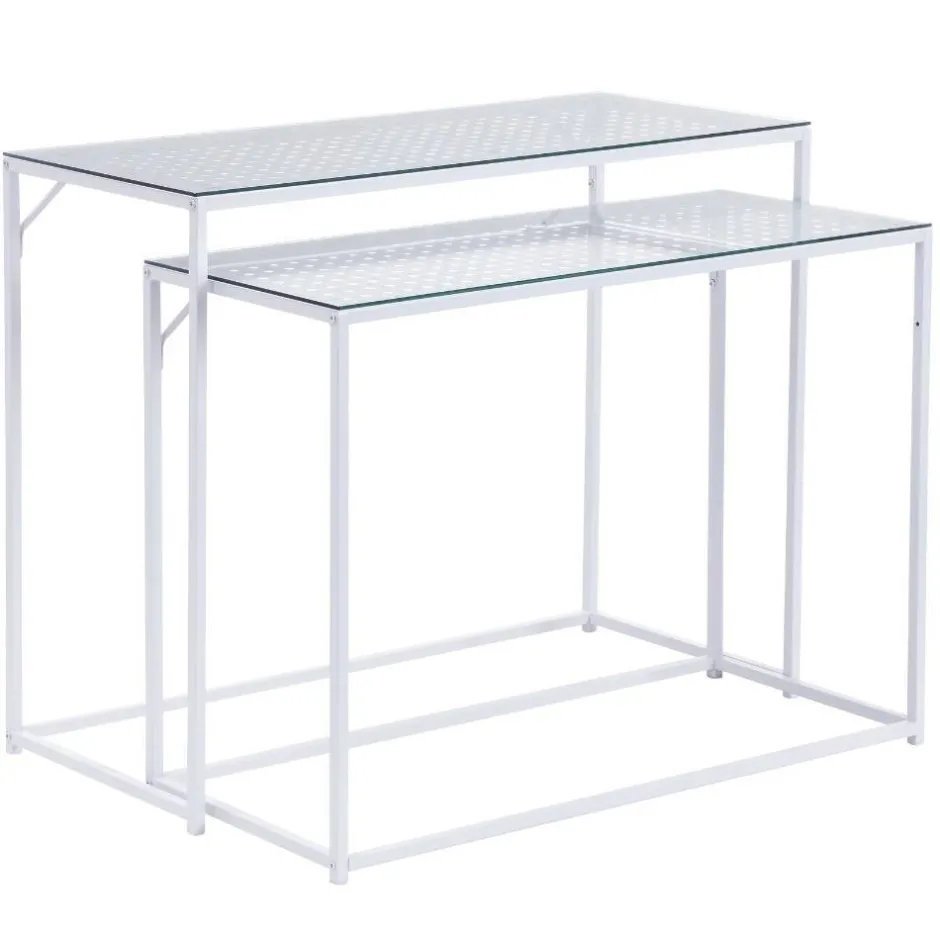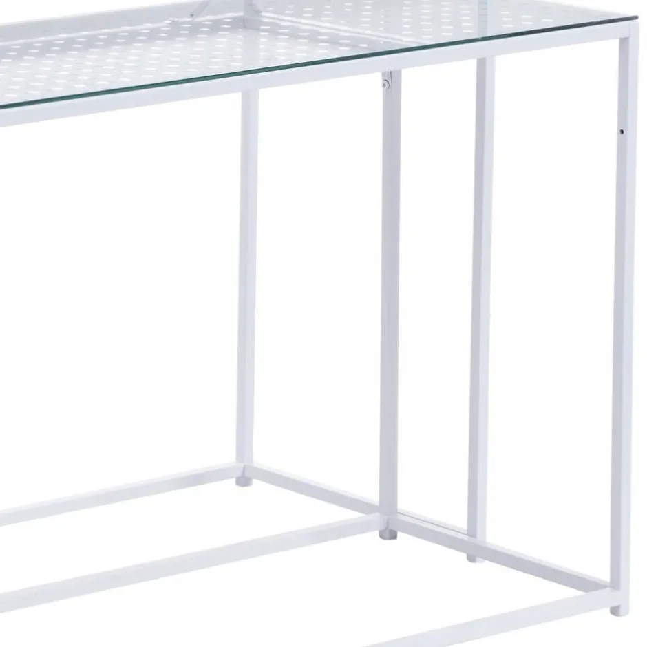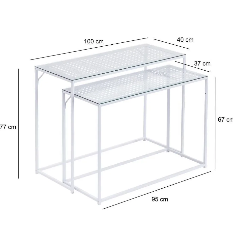 - Tischplatten aus klarem Sicherheitsglas, darunter dekorative Metallgitter