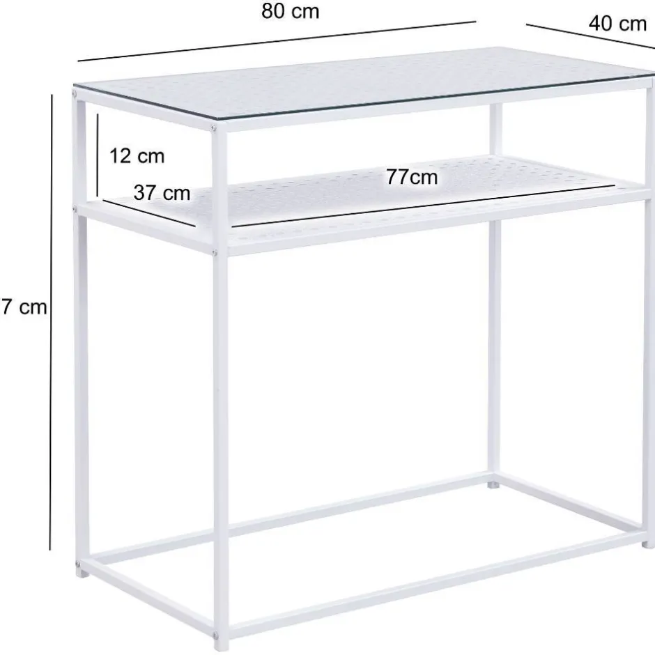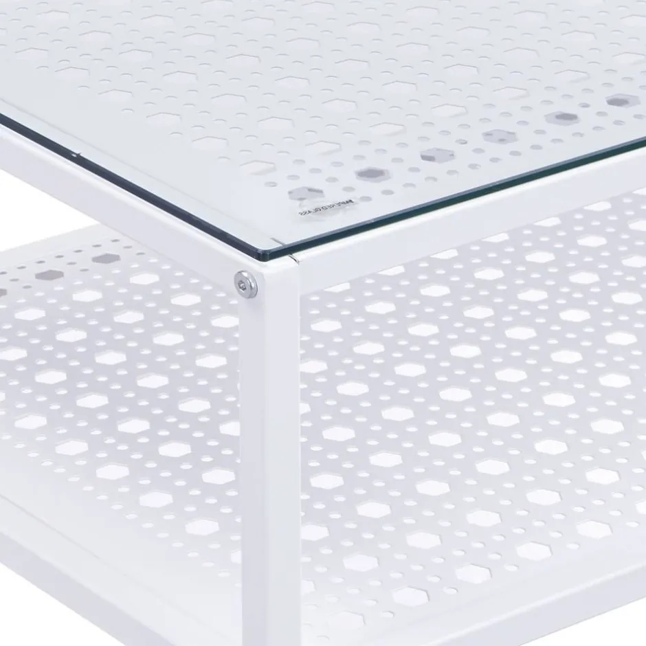 - Tischplatte aus klarem Sicherheitsglas, darunter eine Gitterplatte