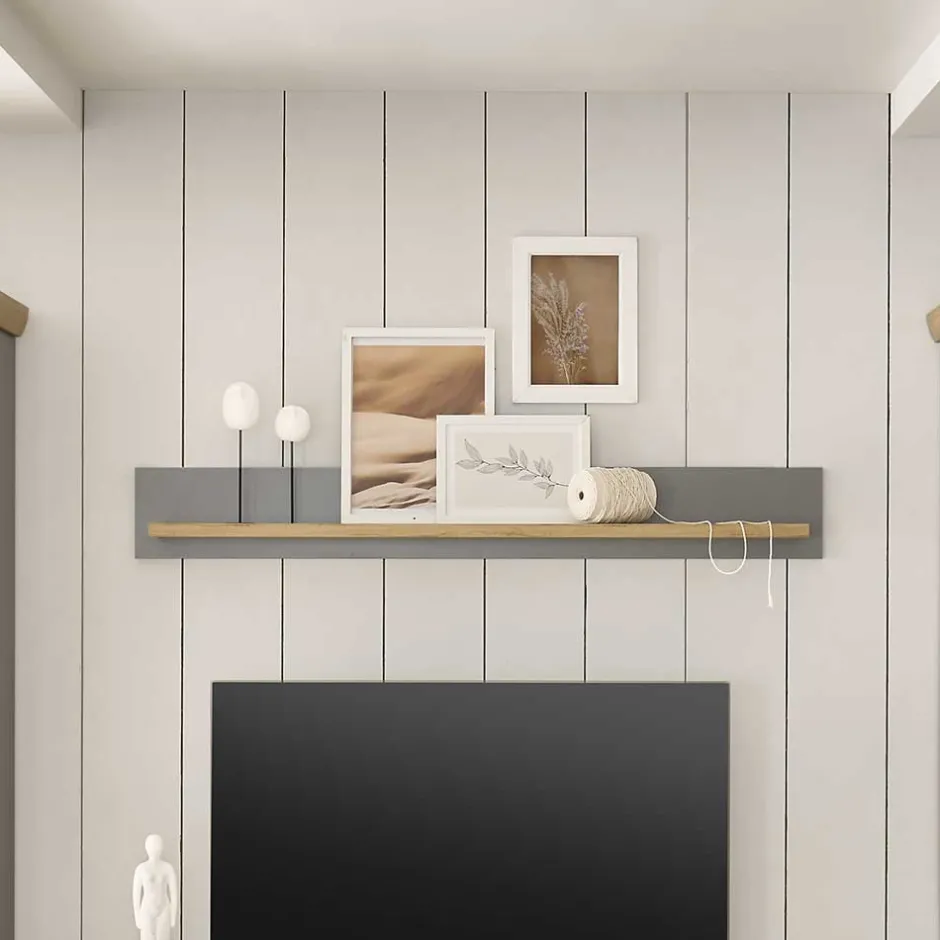 - Schlichtes Wandregal in Lichtgrau und Eichefarben